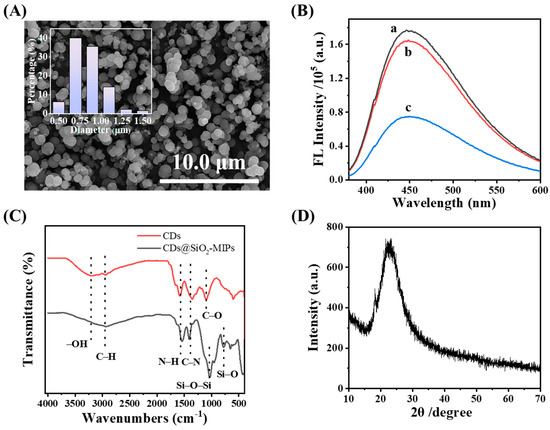 (A) SEM images of CDs@SiO2-MIPs; (B) fluorescence spectra of CDs@SiO2-NIPs (spectrum a) and CDs@SiO2-MIPs after (spectrum b) and before (spectrum c) the removal of TC; (C) FT-IR spectra of CDs, CDs@SiO2-MIPs; (D) XRD pattern of CDs@SiO2-MIPs.