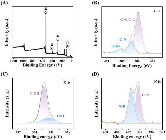The CDs@SiO2-MIPs were analyzed by means of XPS to determine their surface elemental composition, content, and chemical bonding states. In Figure 3A, the XPS survey spectrum shows four noticeable peaks with the binding energies of 285.2, 400.1, 531.8, and 102.9 eV that correspond to the C 1s, N 1s, O 1s, and Si 2p signals, respectively [52]. The high-resolution XPS spectra further elucidate the surface chemistry of the CDs@SiO2-MIPs. The C 1s spectrum (Figure 3B) was deconvoluted into three components at 284.8, 286.1, and 288.3 eV, assigned to C–C/C=C, C–N, and C=O bonds, respectively. Similarly, the O 1s spectrum (Figure 3C) showed two peaks at 531.4 eV (C=O) and 532.3 eV (C–OH), while the N 1s spectrum (Figure 3D) exhibited peaks at 399.3 eV (C–N) and 401.2 eV (N–H) [53]. These findings are fully consistent with the FT-IR results and further confirm that the CDs@SiO2-MIPs were generated successfully.