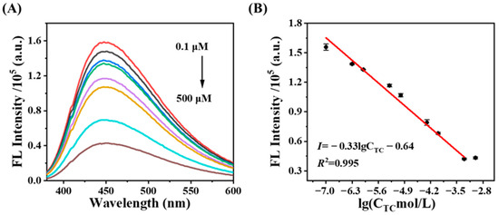 (A) Fluorescence responses of the CDs@SiO2-MIPs toward different concentrations of TC; (B) linear relationship between the logarithm of TC concentration and the fluorescence intensity (F450) of CDs@SiO2-MIPs.