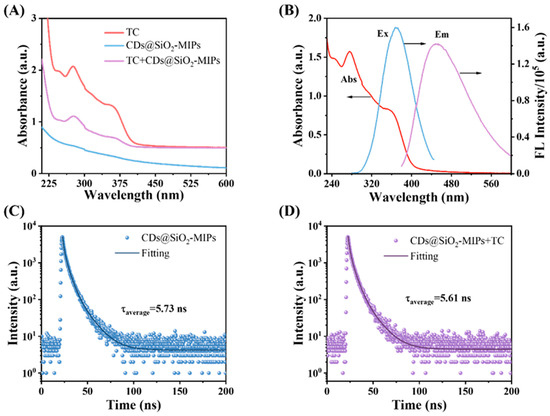 (A) UV–vis spectra of TC, CDs@SiO2-MIP nanocomposite with TC, CDs, and CDs@SiO2-MIP nanocomposite; (B) excitation and emission spectra of CDs@SiO2-MIPs and UV–vis absorption spectra of TC; fluorescence decay profile of the CDs@SiO2-MIPs in the absence (C) and presence (D) of TC.