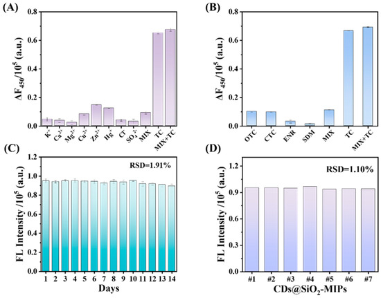 (A) Influence of coexisting common ions (250 μM); (B) quenching effects of synchronous fluorescence of CDs@SiO2-MIPs to OTC, CTC, ENR, SDM, and TC in water (each of the concentrations was 250 μM); (C) the stability of the fluorescence sensing system over time; (D) the precision of sensors constructed in different batches.