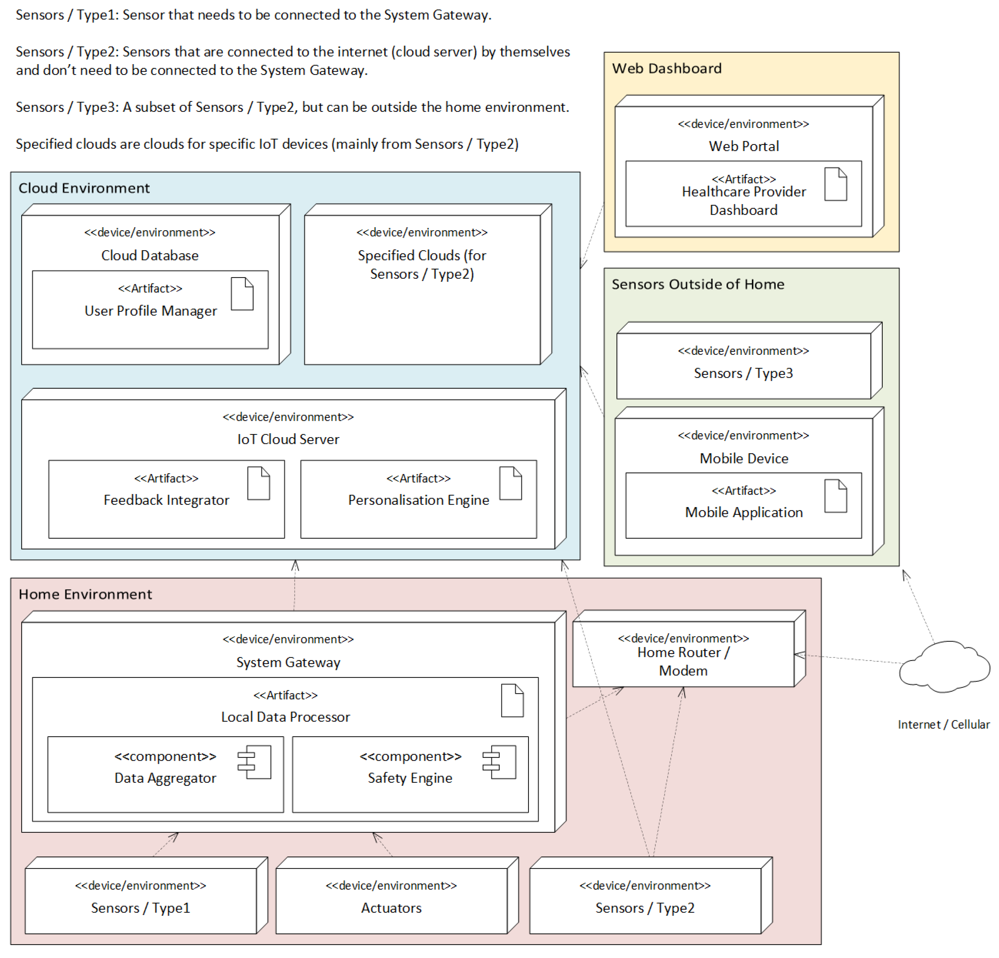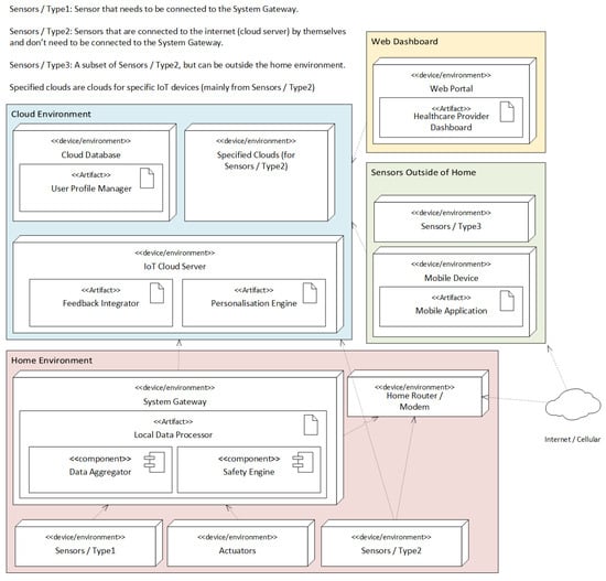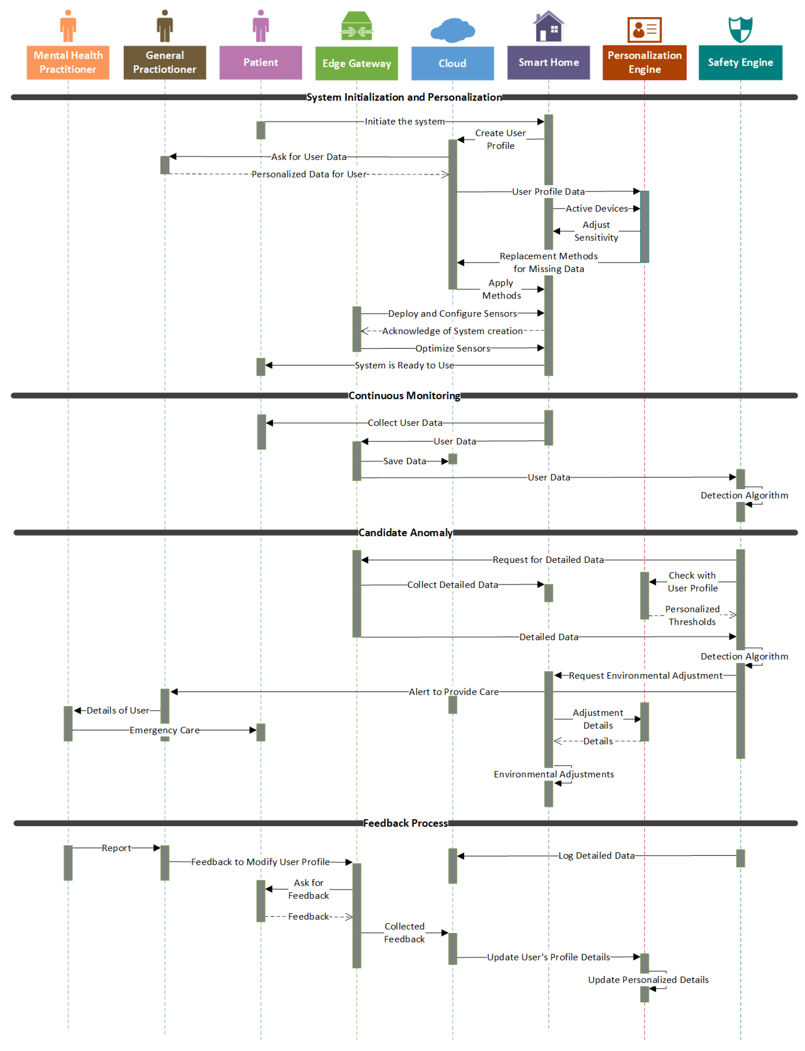| Personalization (Figure Table 3) | Personalisation Engine (Figure 2 and Figure 4)—User Dashboard (Figure 2 and Figure 4)—User Profile on Cloud (Figure 4)—Integrating different sensors (Figure 4)—Ask user data from General Practitioner (Figure 3)—Adjust devices and sensitivity (Figure 3) | Adaptable thresholds—Behavioral baselining in algorithms—User-specific anomaly models by checking with user profile—Setting up based on the user’s devices | User module to build user-specific behavioral models and adapt thresholds over time—System configuration based on the user’s specified devices | Individualized thresholds used during verification, and using the user’s available set of devices | Hosting behavioral models and user data in the cloud enables modifications as user thresholds change |