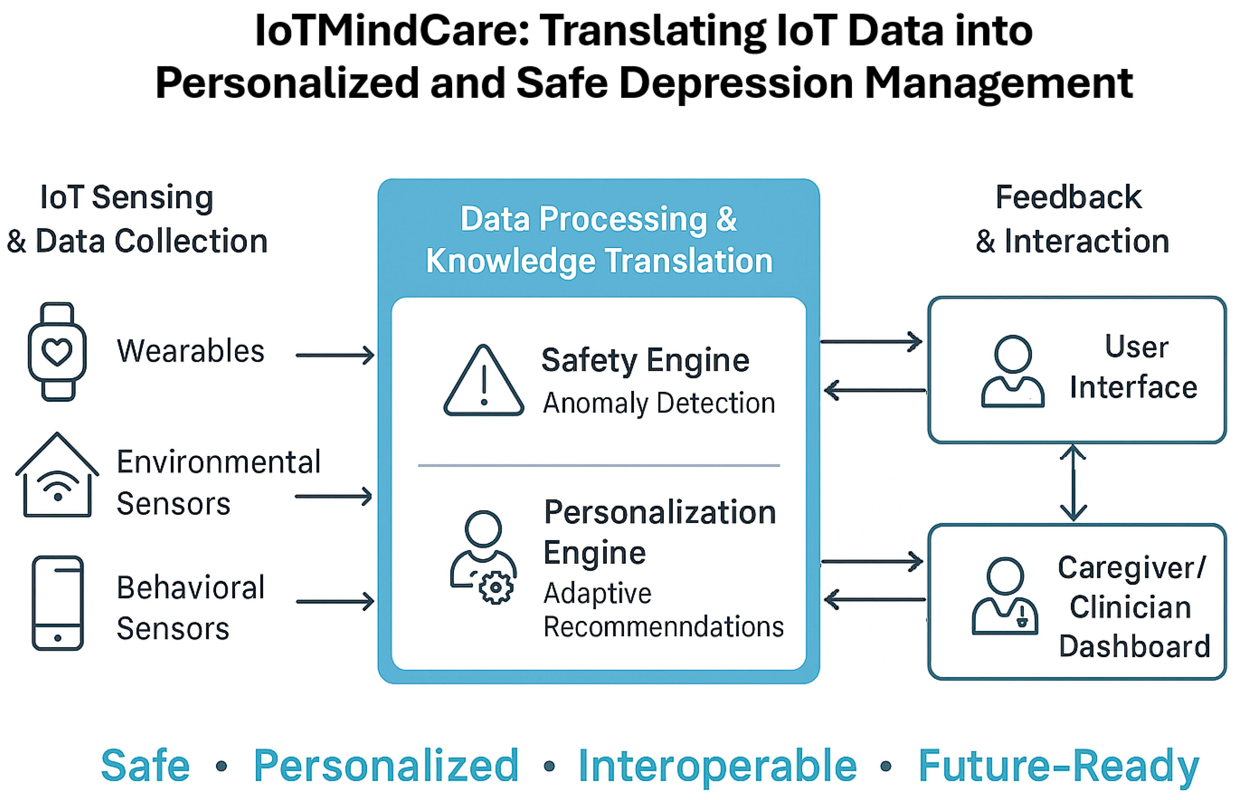 | Explainable Wearable Monitoring [16] | Depression/anxiety detection from wearables | Explainable anomaly detection, multimodal fusion | Transparent AI model linking sensor data to mental state changes | Lacks a modular IoT reference architecture or cross-platform interoperability |