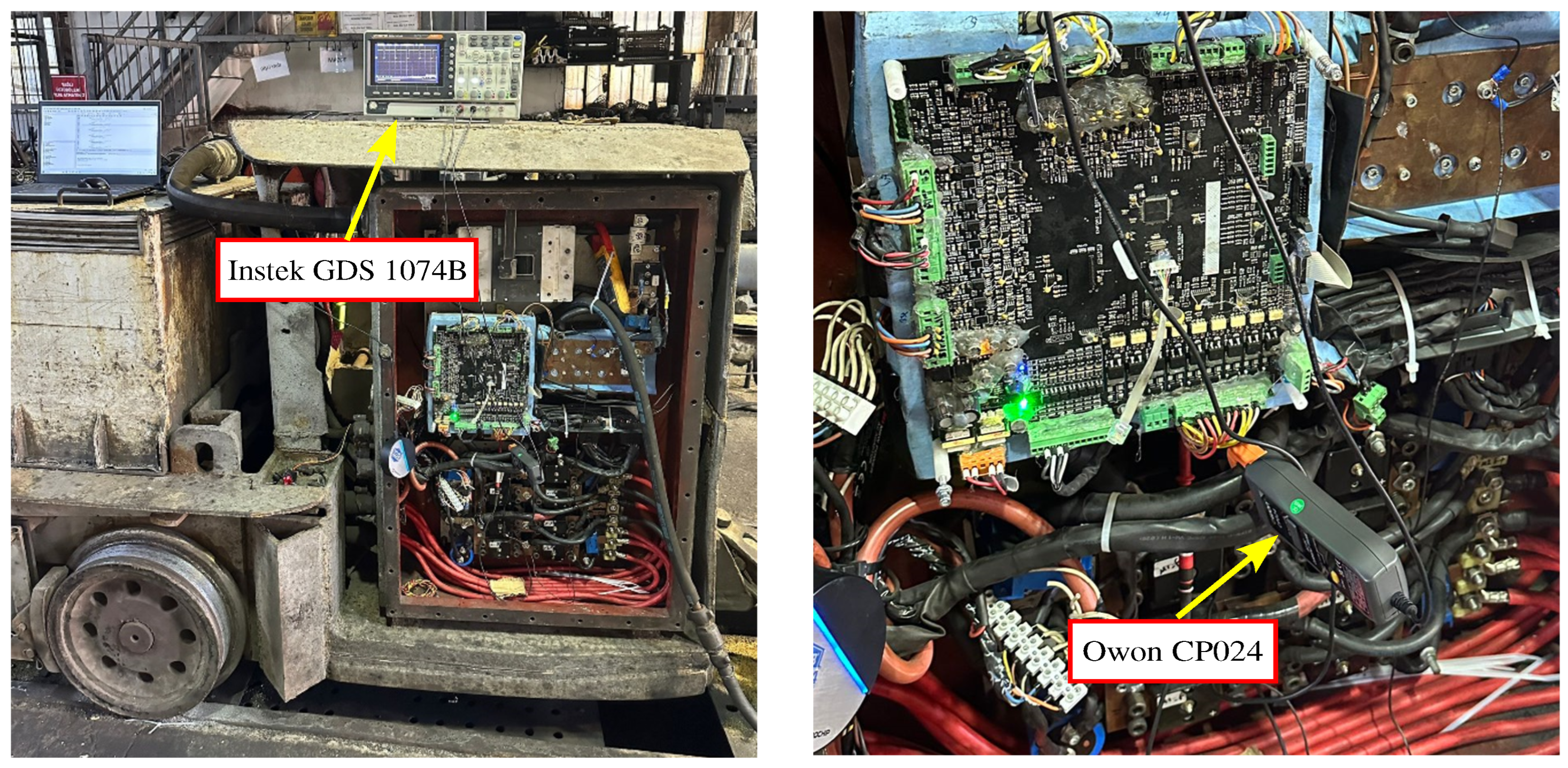 Section 4, in order to validate the theoretical and simulation studies, field tests are conducted on battery-powered locomotives used in underground mining operations. A hardware prototype of a series DC motor driver circuit, compatible with the proposed control structure, is designed and implemented. During field tests, motor current values are measured under fixed PWM duty cycle and fixed current conditions at different switching frequencies, and these results are compared with both theoretical and simulation data. Finally, the IGBT temperatures are measured under field conditions, showing strong agreement with the theoretical predictions.