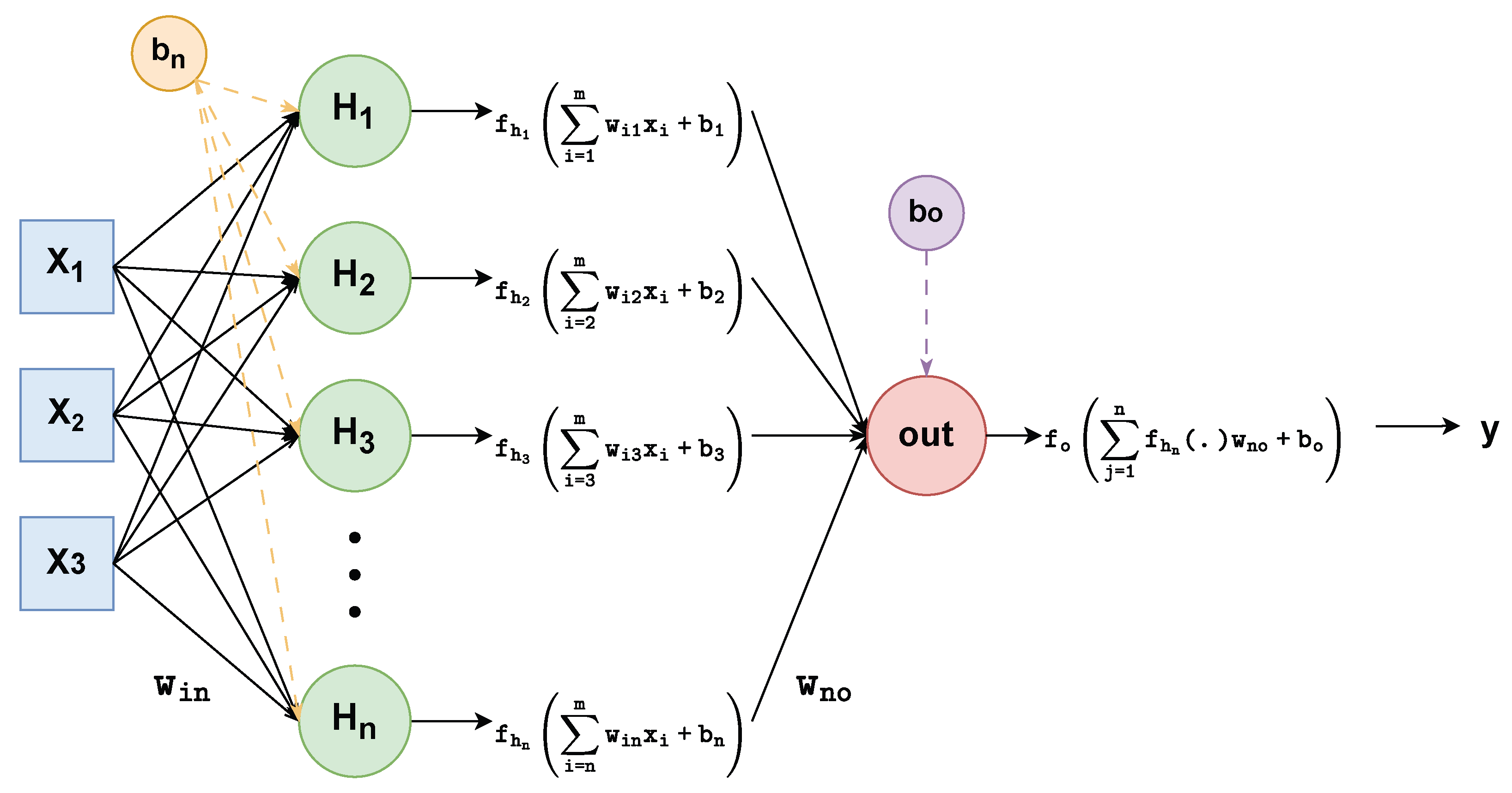 Among various learning algorithms available in the literature, MLP is selected in this study due to its structural simplicity and efficiency in handling large-scale prediction problems. The output of a single-hidden-layer MLP can be mathematically represented as follows: