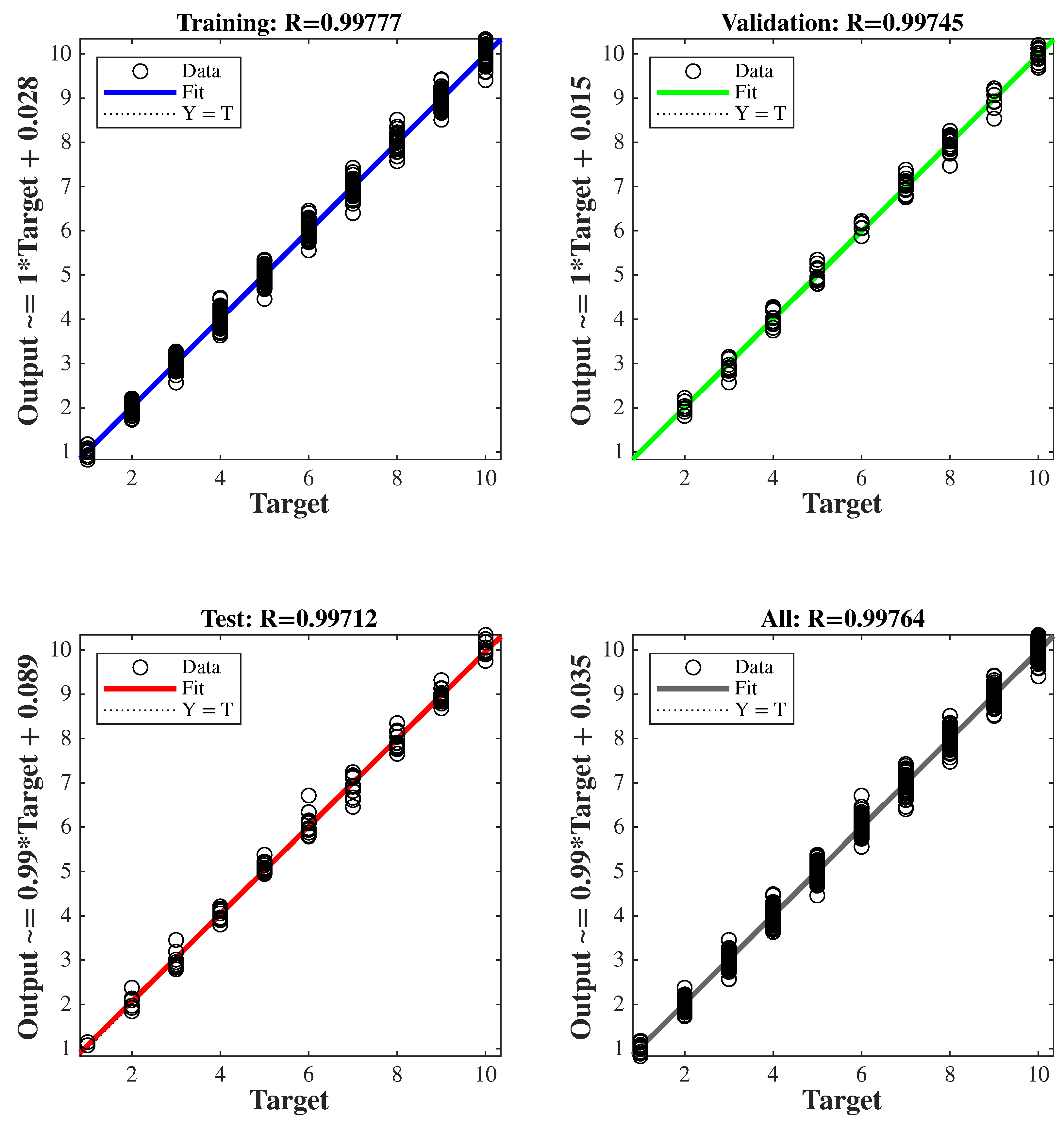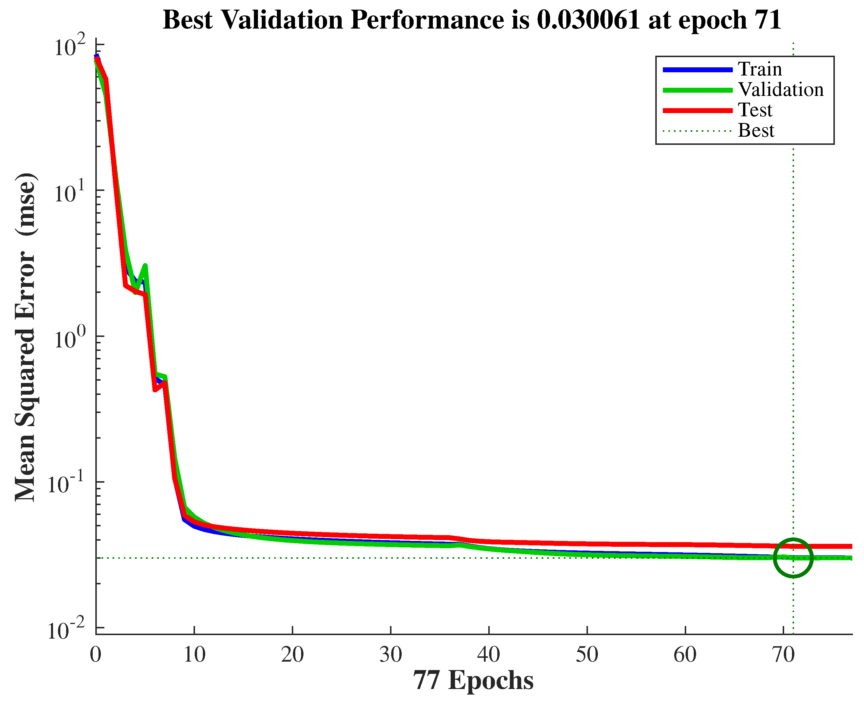 Figure 16. The network achieved its optimal performance at approximately 71 epochs, yielding an MSE value of 0.003, which demonstrates the network’s high-level learning and prediction accuracy. The close agreement between the training, validation, and test performances indicates that the model exhibits no signs of overfitting, confirming the generalization capability and robustness of the proposed ANN.