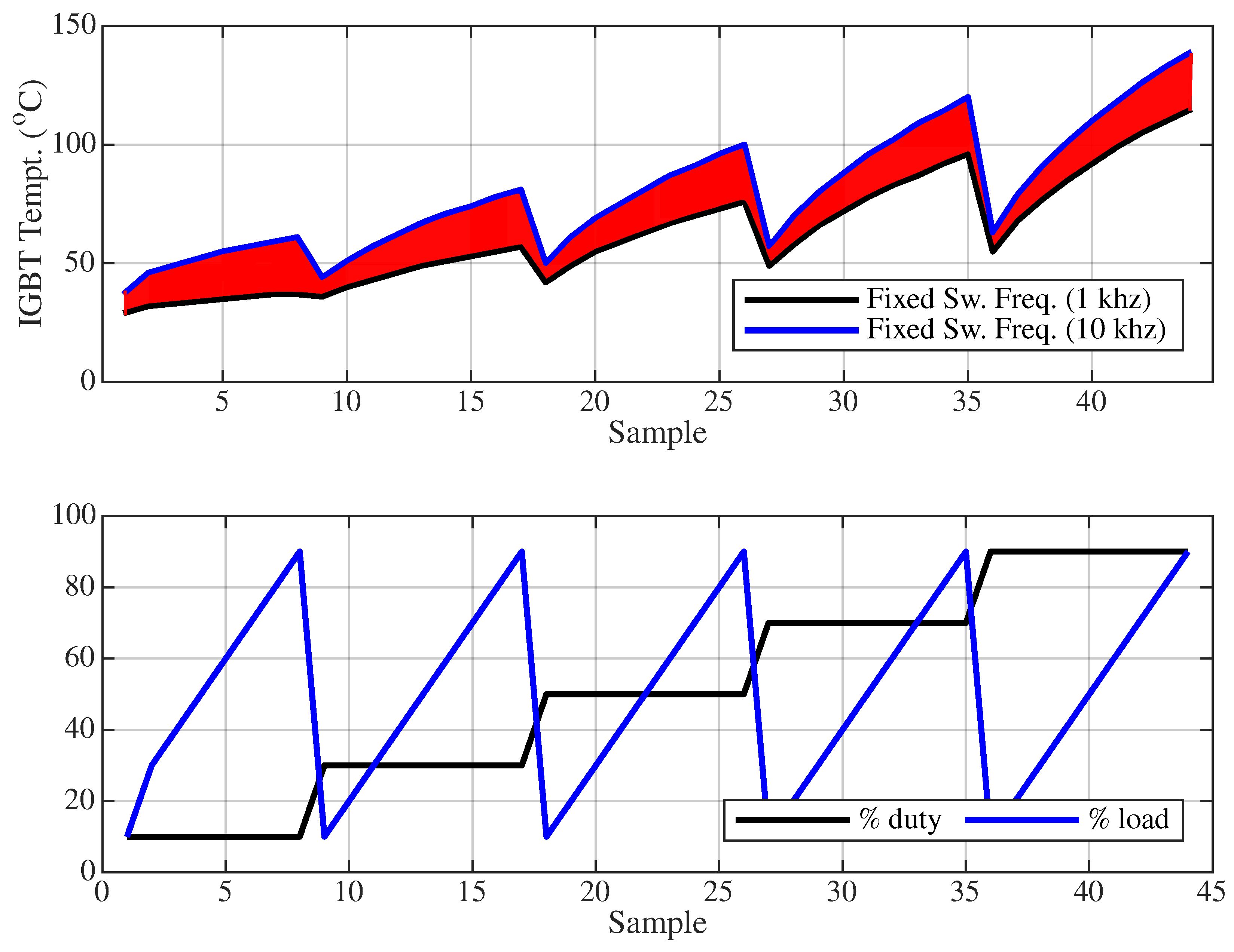 Figure 17, two different scenarios are defined, where the IGBT temperature ranges are 32–77 °C and 58–140 °C, respectively. In both scenarios, 500 sample points are randomly generated based on arbitrary load and duty cycle combinations. Due to randomness, consecutive samples within a scenario may cause instantaneous two-way changes between the minimum and maximum temperature values. For instance, in Scenario 1, the IGBT temperature can suddenly vary from 32 °C to 77 °C or vice versa. Although such abrupt changes are unlikely to occur under practical operating conditions, randomly generated samples were intentionally used to stress-test the ANN-based variable switching frequency approach.