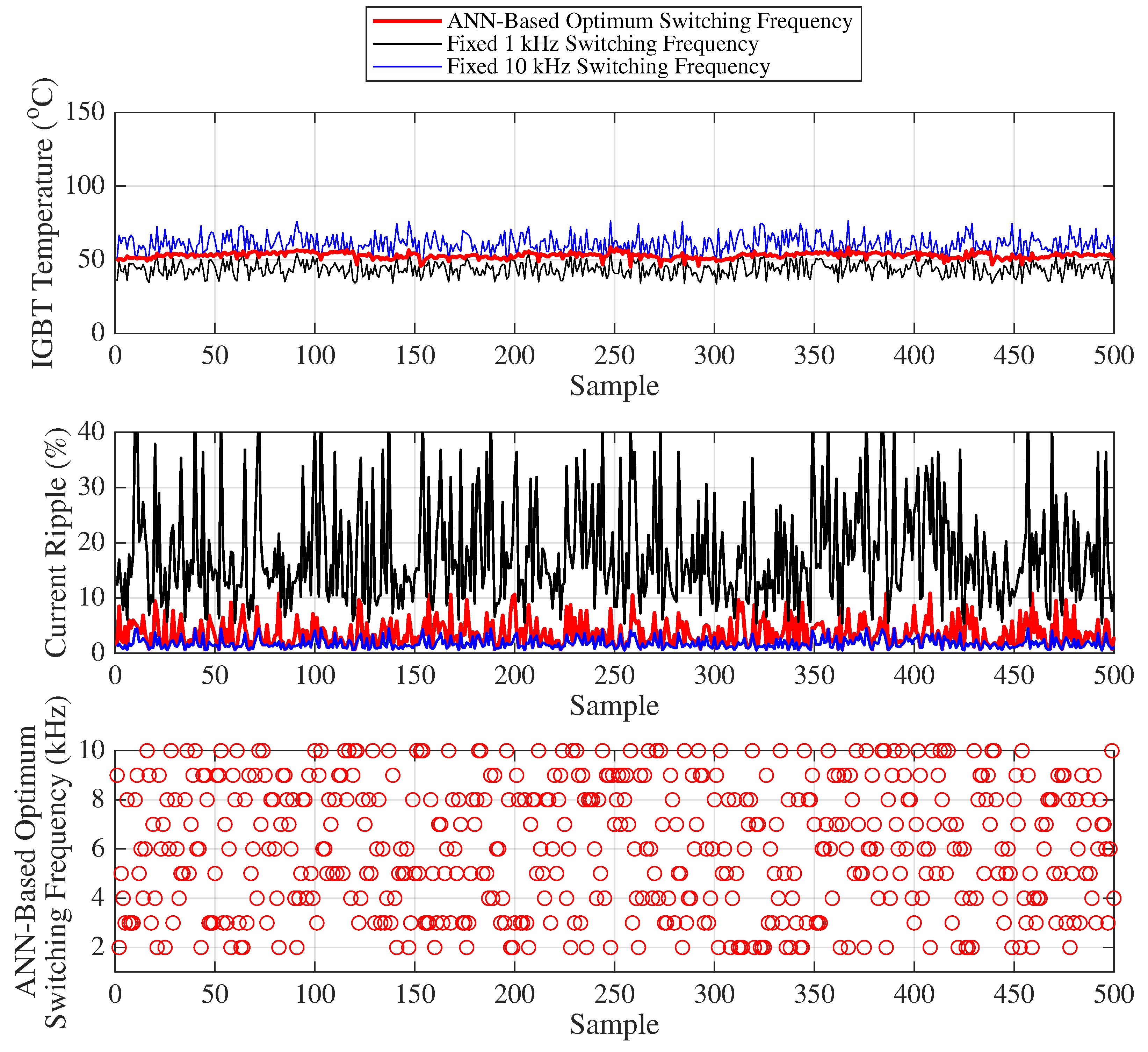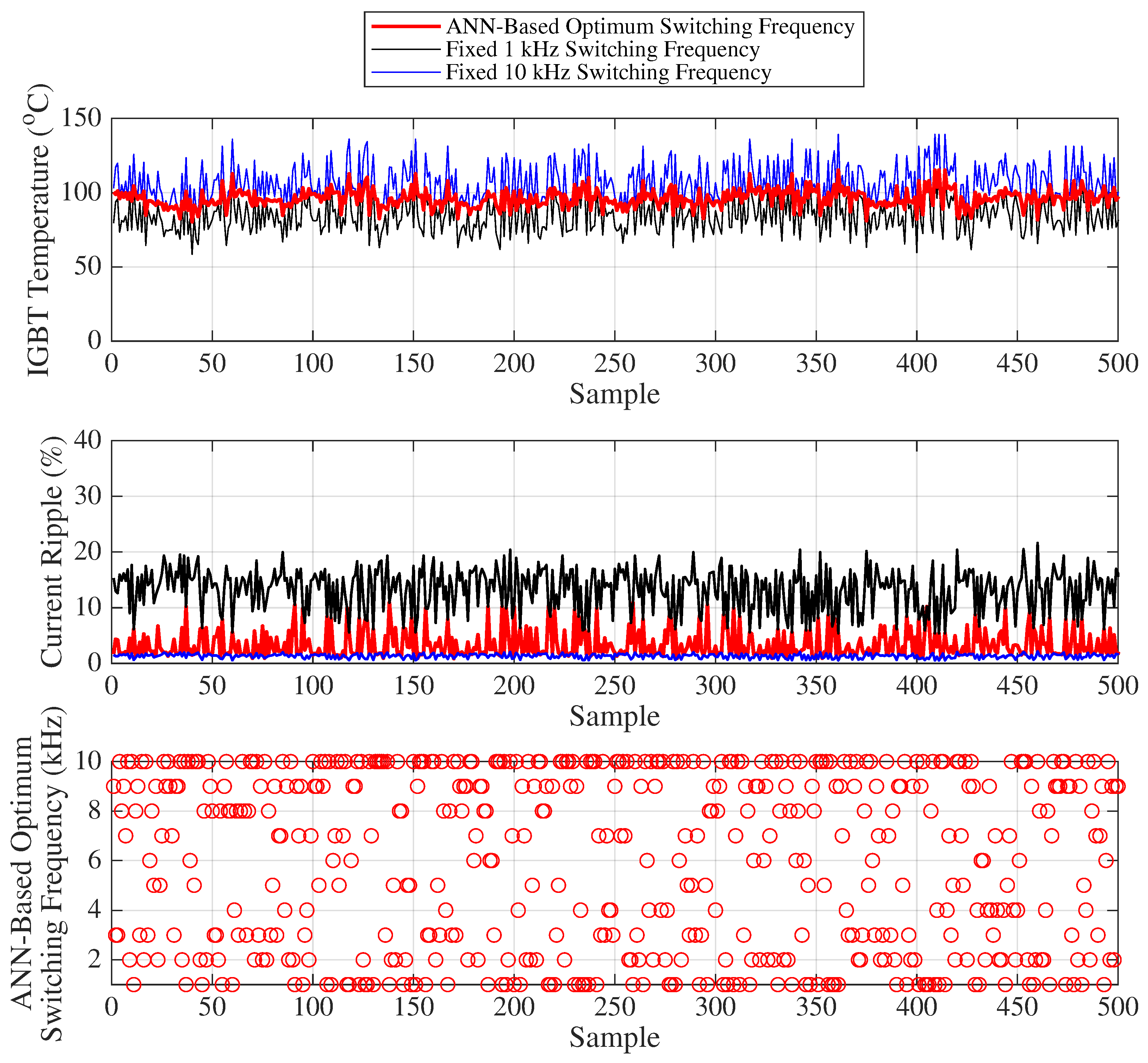 Figure 18 presents the variation of the IGBT temperature, motor current ripple, and the optimal frequency predicted by the ANN for 500 randomly selected samples, where load and duty cycle values are chosen such that the IGBT temperature range varies between 32 °C and 77 °C for Scenario 1. To avoid visual complexity, only two fixed switching frequencies (1 kHz and 10 kHz) are compared with the ANN-based optimum switching frequency approach in