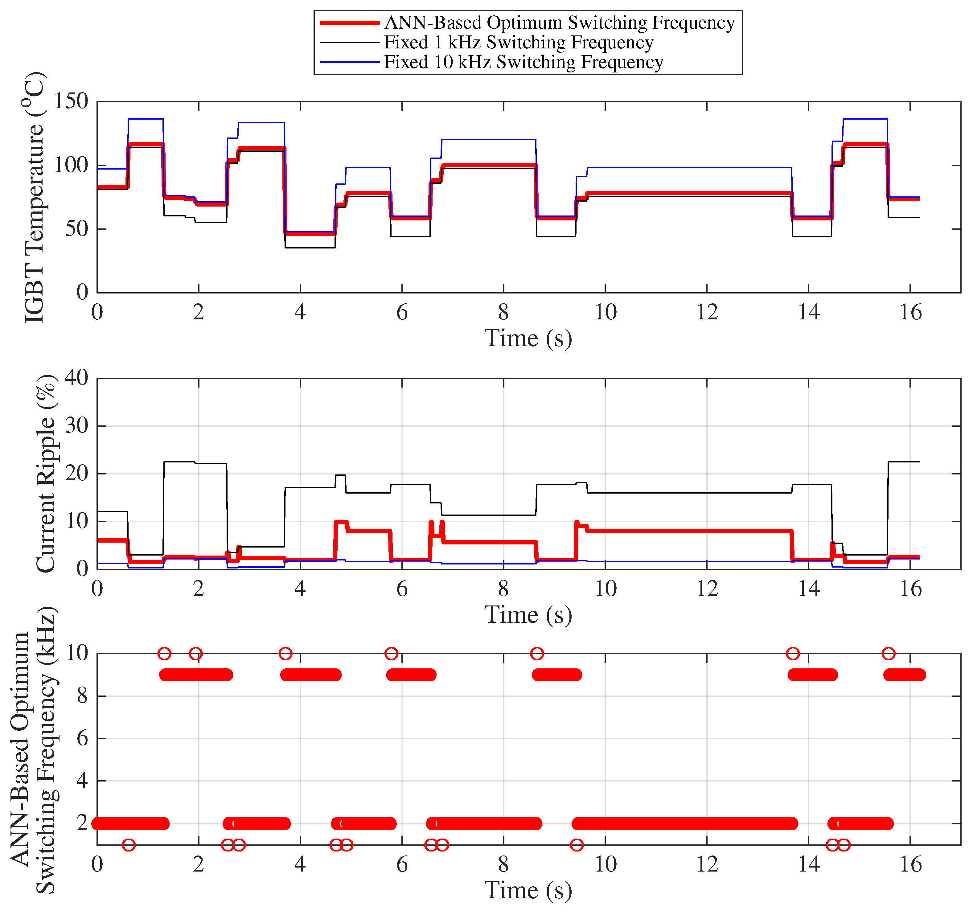 Figure 21, the variations in IGBT temperature, motor current ripple, and the optimal switching frequency obtained by ANN are presented under full load conditions.