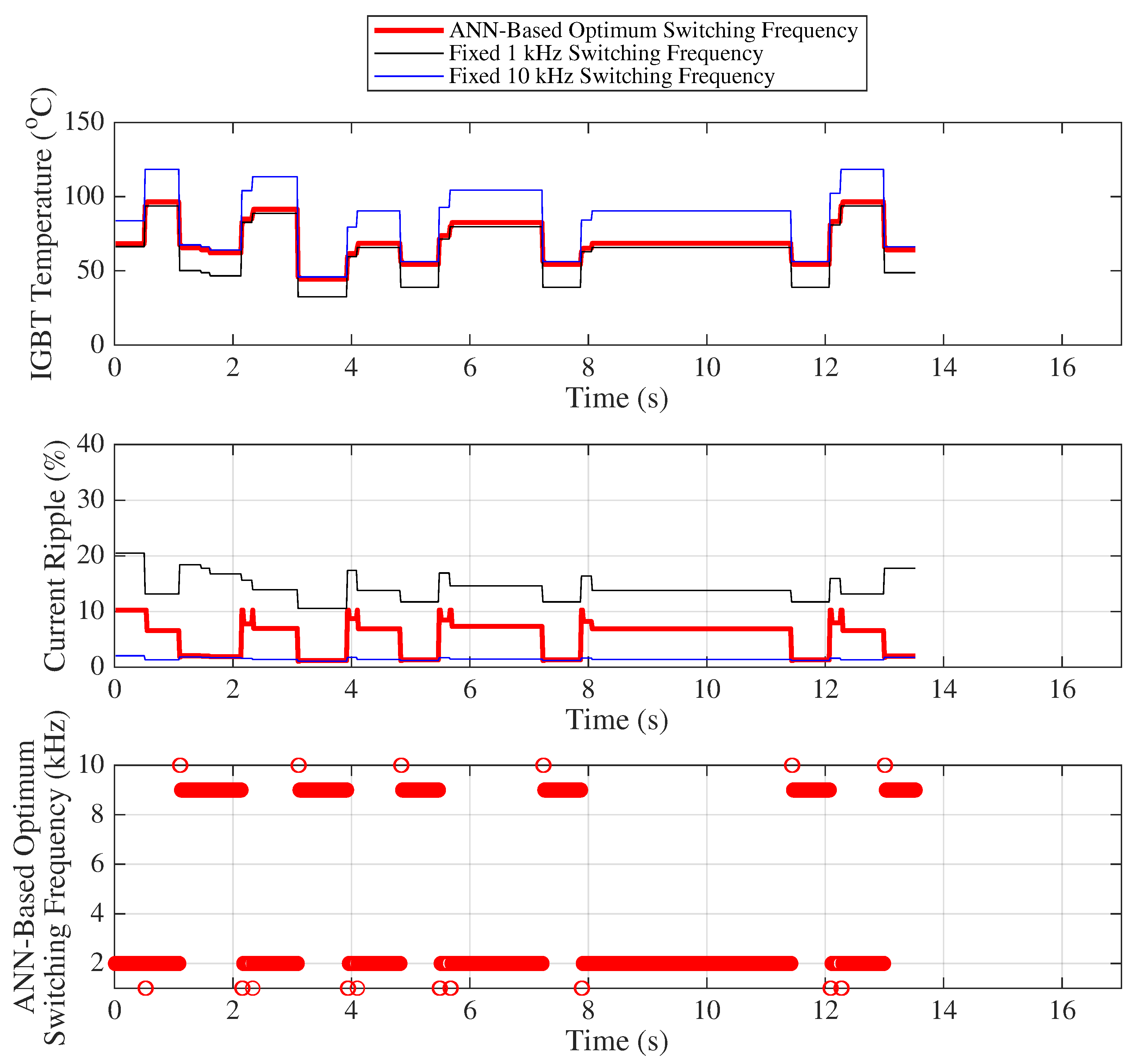 Figure 22, the variations in IGBT temperature, motor current ripple, and the optimal switching frequency obtained by ANN are presented under half load conditions.