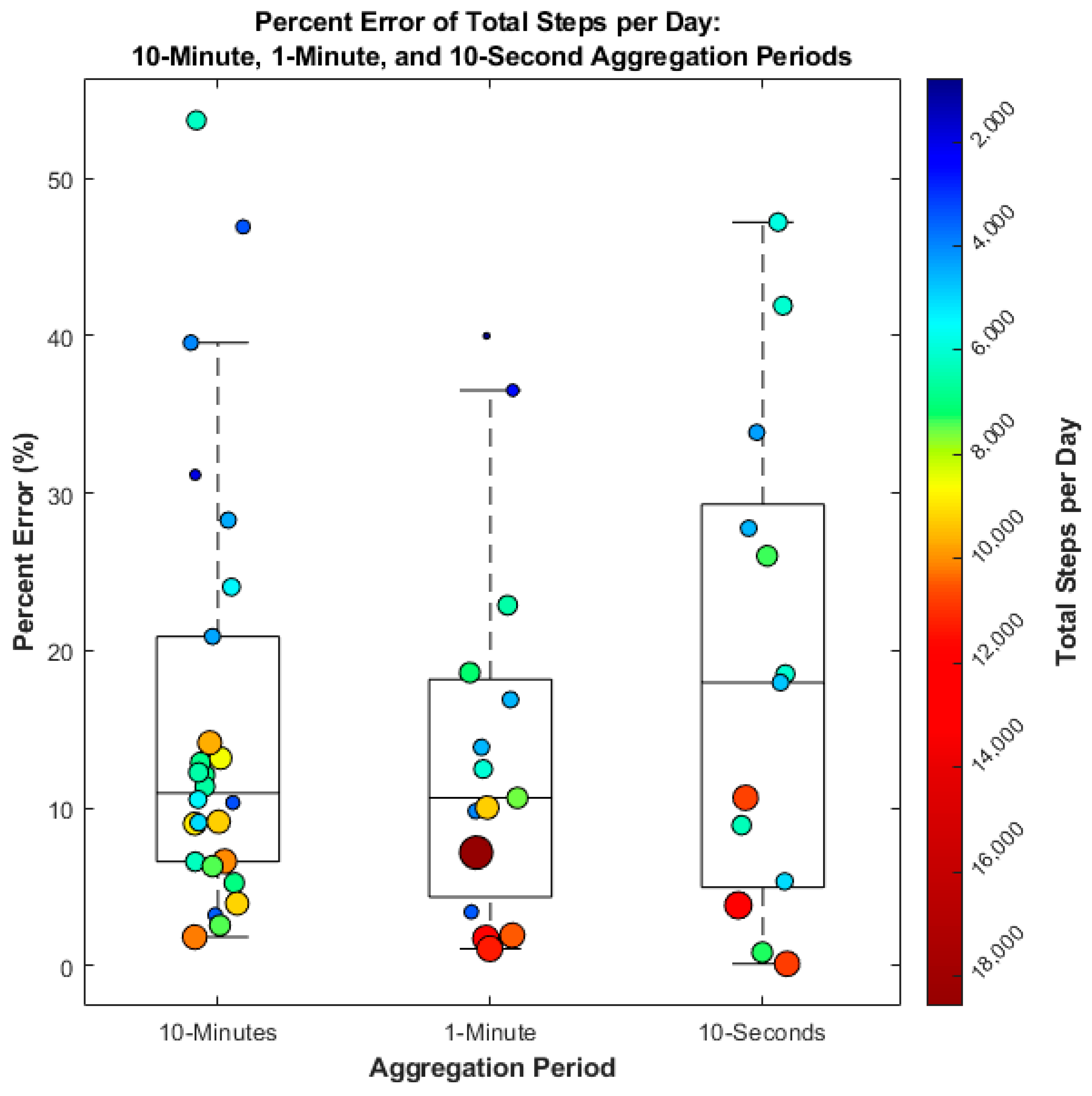 - Aggregating step count into large aggregation periods significantly increases error and underestimation of step count in lower-power wearables