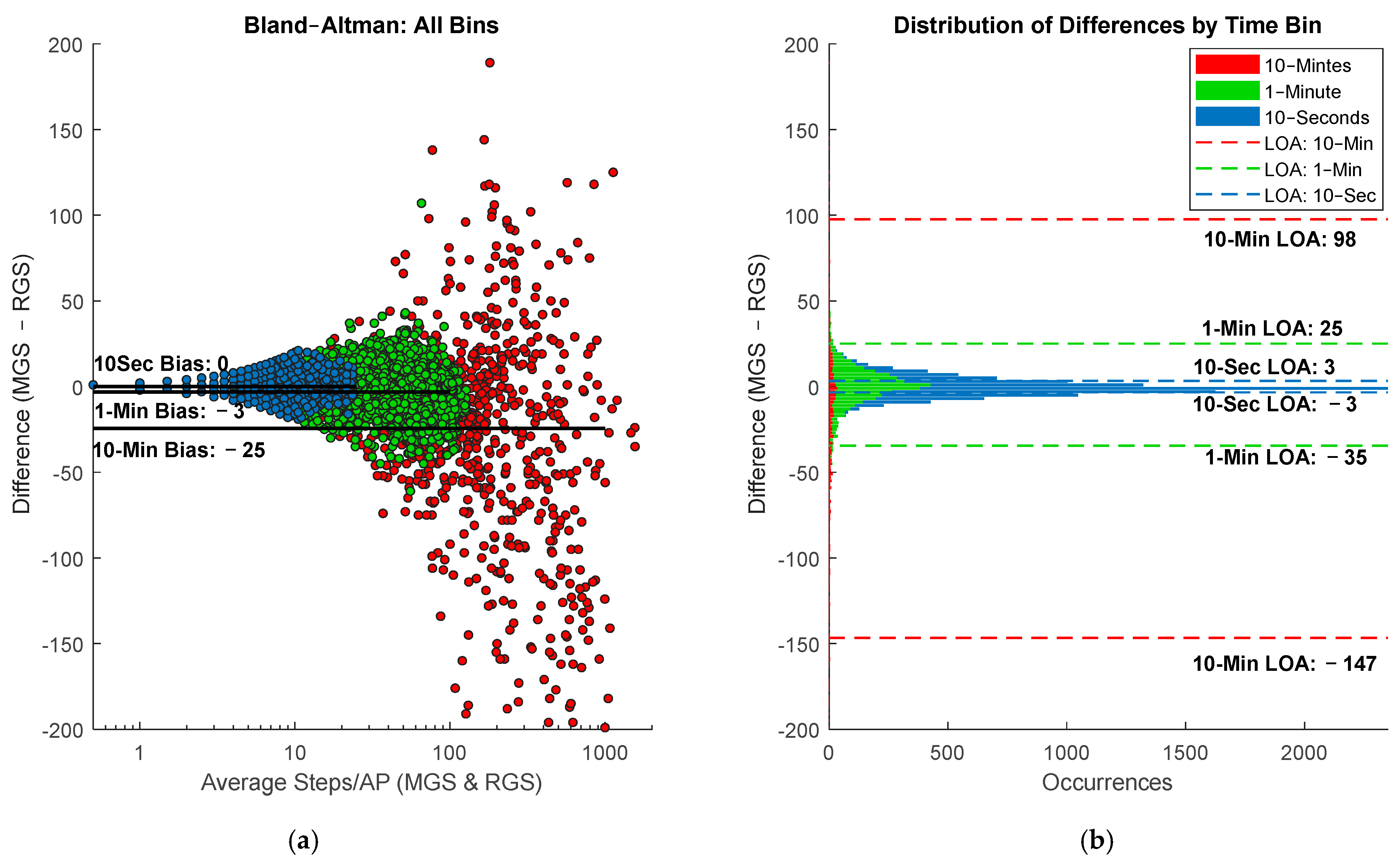 | Range of Total Steps/Bin | All Bins Bias (LOA) | 10-Min Bias (LOA) | 1-Min & 10-Min Bias (LOA) | 1-Min Bias (LOA) | 10-s & 1-Min Bias (LOA) | 10-s Bias (LOA) | 10-Min & 10-s Bias (LOA) |