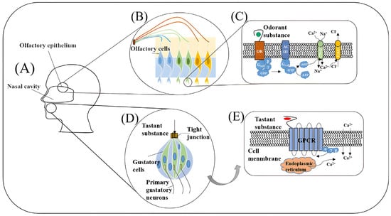 The mammalian olfactory and gustatory systems serve as highly specialized chemical detection networks, capable of recognizing and discriminating complex stimuli even at trace concentrations. In the olfactory system, detection begins in the main olfactory epithelium, where each olfactory sensory neurons (OSNs) expresses a single odorant receptor (OR), which belongs to the G protein-coupled receptor (GPCR) family []. Axons from OSNs that express the same OR converge onto specific glomeruli in the olfactory bulb, forming a chemospatial map that preserves receptor identity and supports odor discrimination [,]. This precise organization, maintained despite continuous OSN renewal, enables the system to detect volatile compounds at concentrations below the picomolar range. Signals from glomeruli are processed by mitral and tufted cells and relayed to higher brain areas, including the piriform cortex, where both innate and learned odor recognition take place []. Accessory olfactory structures, such as the vomeronasal organ, contribute to pheromone detection and social communication, with their functions integrated at the amygdala level.