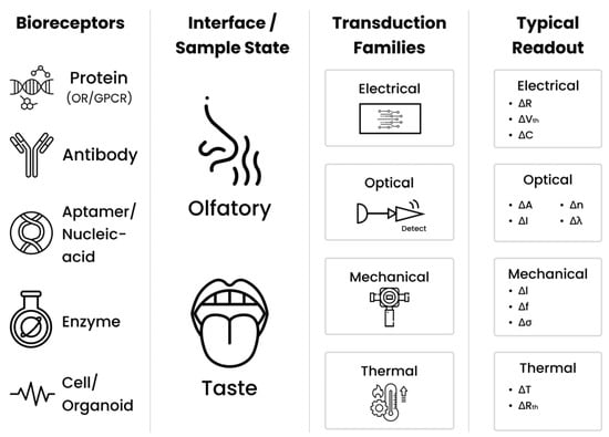Biomimetic olfactory and taste biosensors are directly inspired by the human senses of smell and taste. They use biorecognition molecules, bioengineered receptors, and transducer components to mimic how our bodies detect and interpret chemical signals [,]. By selectively binding to target molecules and converting these interactions into measurable signals, these sensors achieve high sensitivity and specificity, which is essential for critical applications such as food safety, environmental monitoring, security screening, and medical diagnostics [,]. Some designs incorporate advanced biological elements such as organoids or the ligand-binding domains of human taste receptors to emulate natural sensing pathways, enabling detection at picomolar concentrations and the ability to distinguish complex analyte mixtures, even in challenging real-world samples []. In addition to biological components, new materials enhance the durability and versatility of these sensors. Antifouling films, molecularly imprinted layers, and nanostructures such as graphene, metal–organic frameworks (MOFs), and gold nanoparticles improve the devices’ stability and performance across food, environmental, and health fields [,,].