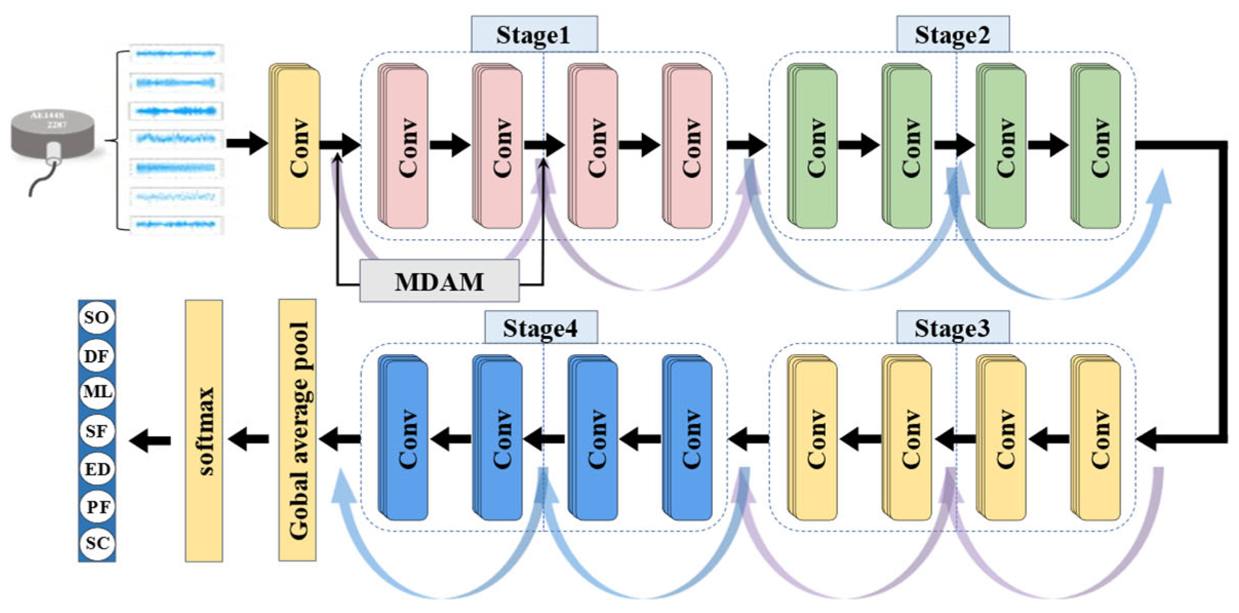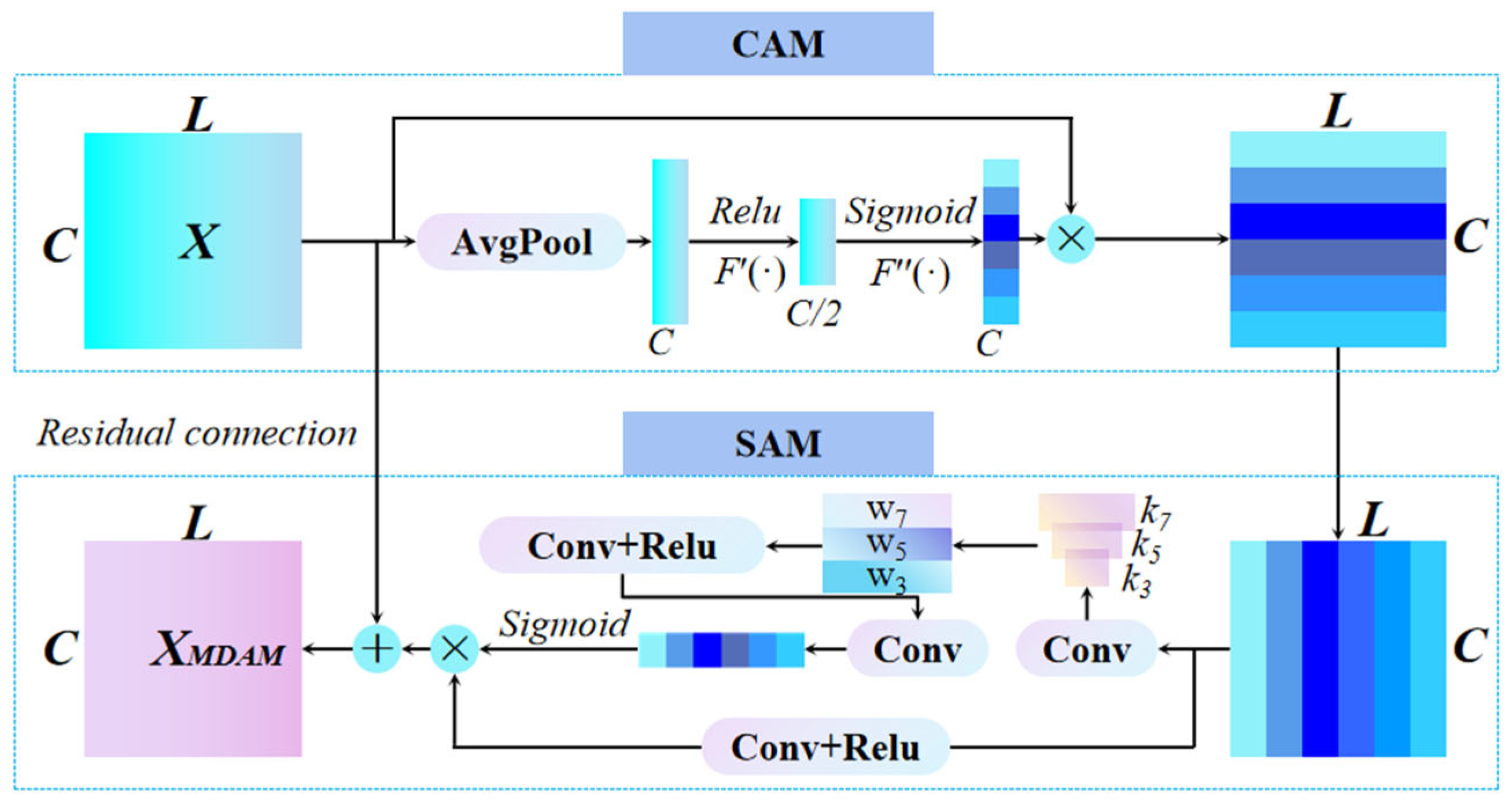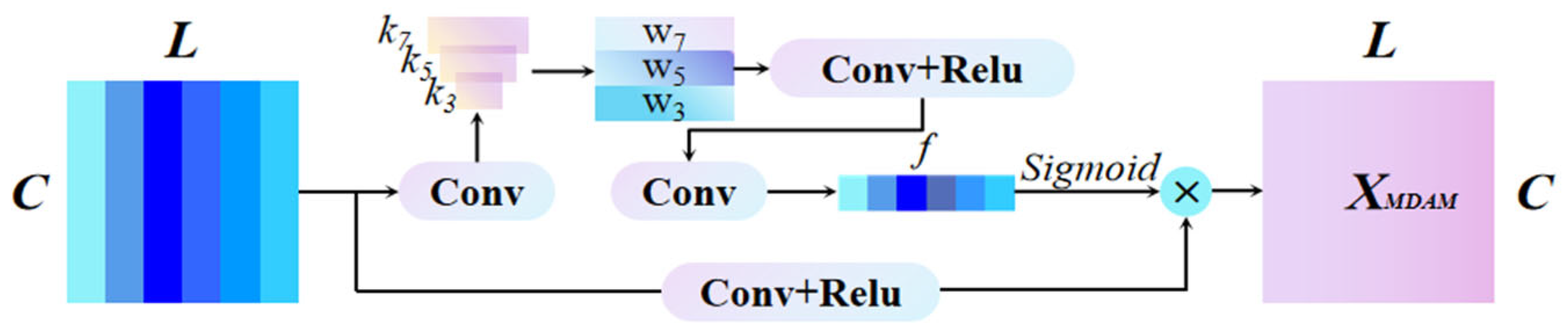 | 1 | Conv | 7 × 1 | 16 | 2 | MDAM | 3750 × 16 |