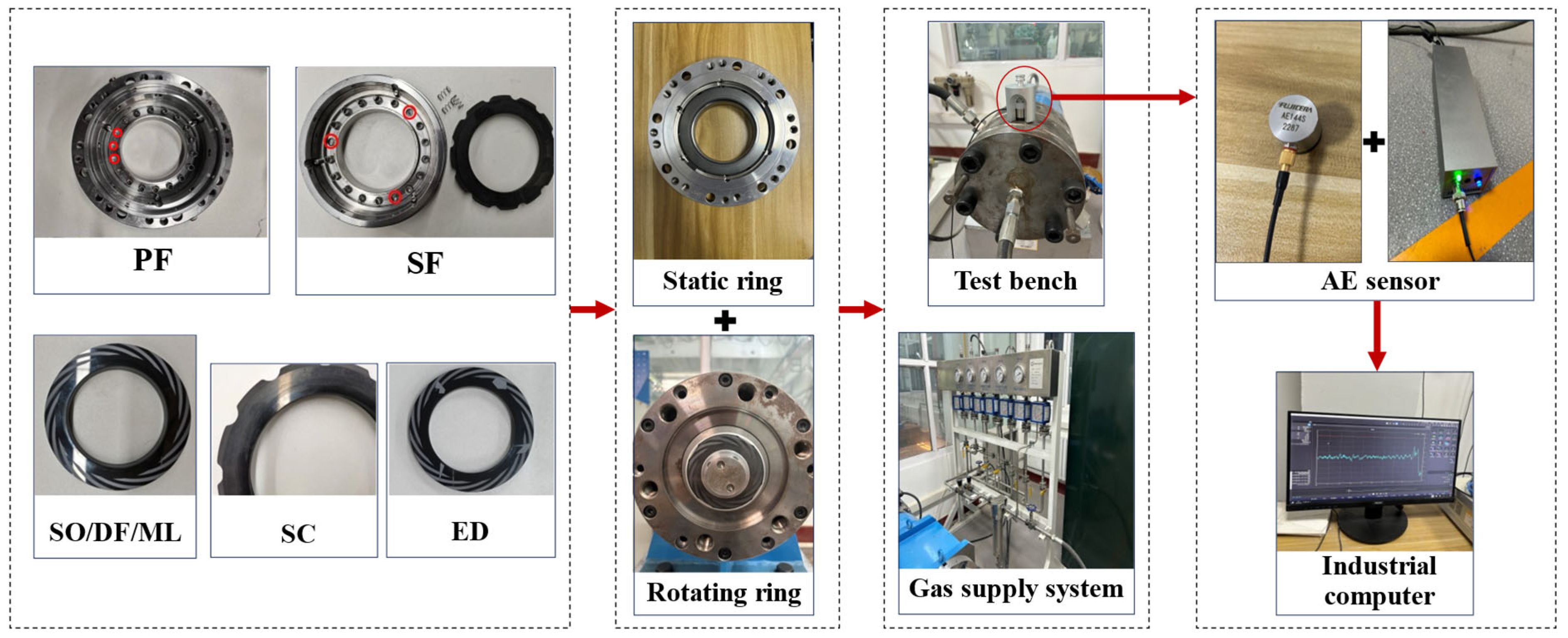 - Experimental Design and Data Enhancement: We designed seven common operational conditions, including four structural fault conditions of the seal face and three operational states during startup: dry friction (50 rpm), mixed lubrication (600 rpm), and stable operation (1000 rpm). AE technology was used to monitor the seal status. A data augmentation strategy involving noise injection was implemented to expand the sample set and enhance the noise robustness of the input data.