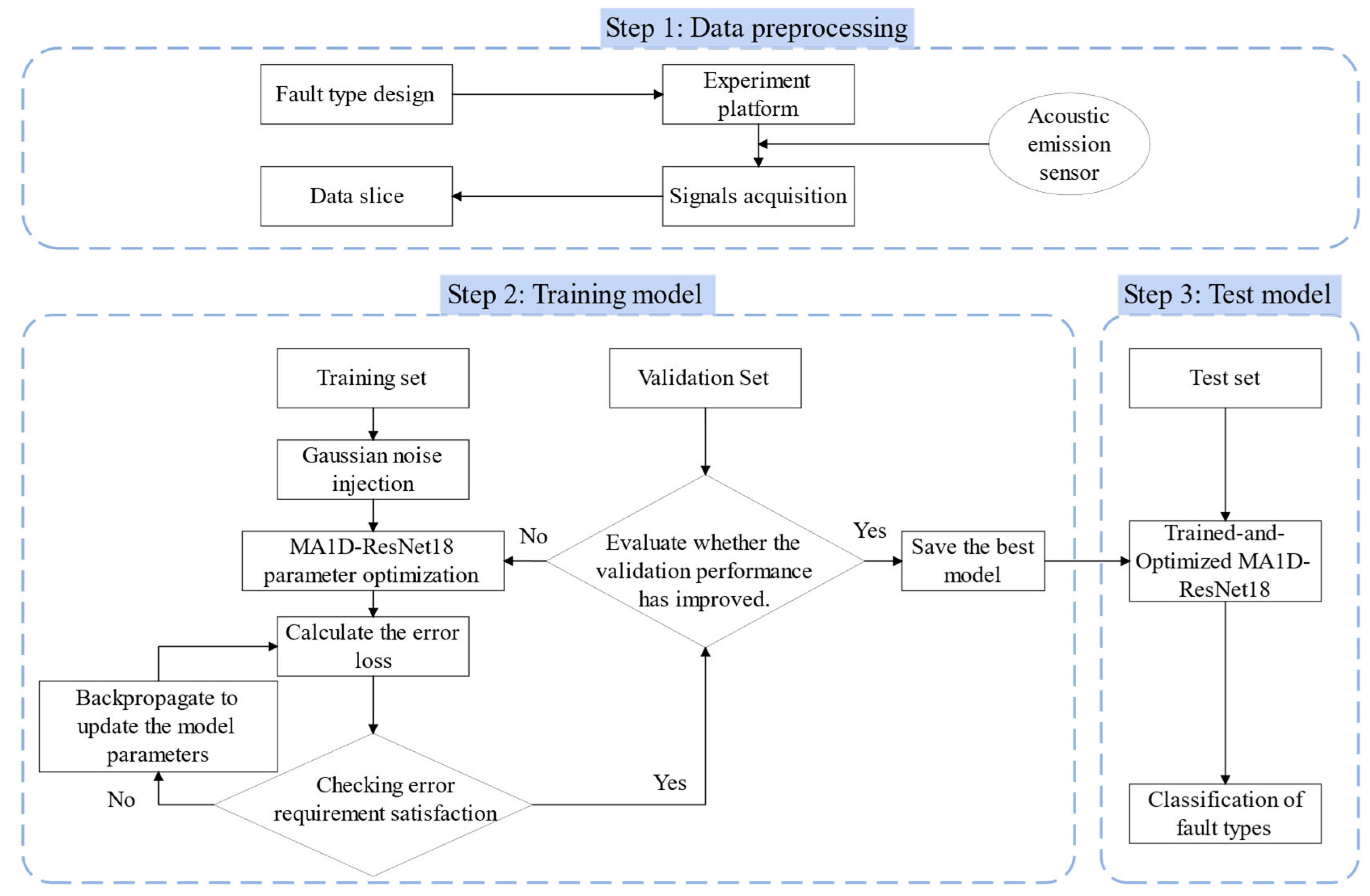- Comprehensive Validation: We validated the data augmentation method and the MA1D-ResNet model using a self-constructed dataset. Comparative experiments with five existing models under identical parameter settings, including accuracy, loss, and noise immunity tests, demonstrate that our method offers superior diagnostic performance and better robustness to noise.