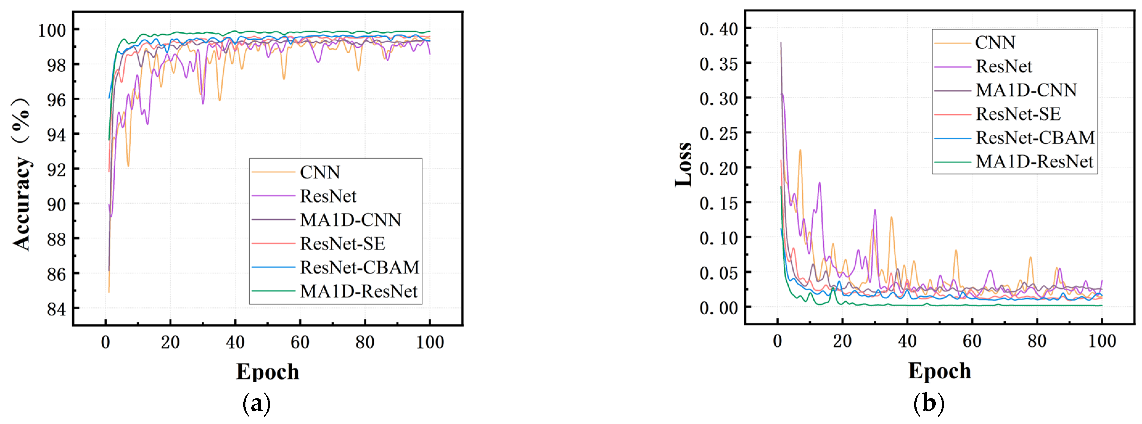| SNR (dB) | CNN (Acc%) | ResNet (Acc%) | MA1D-CNN (Acc%) | ResNet-SE (Acc%) | ResNet-CBAM (Acc%) | MA1D-ResNet (Acc%) |