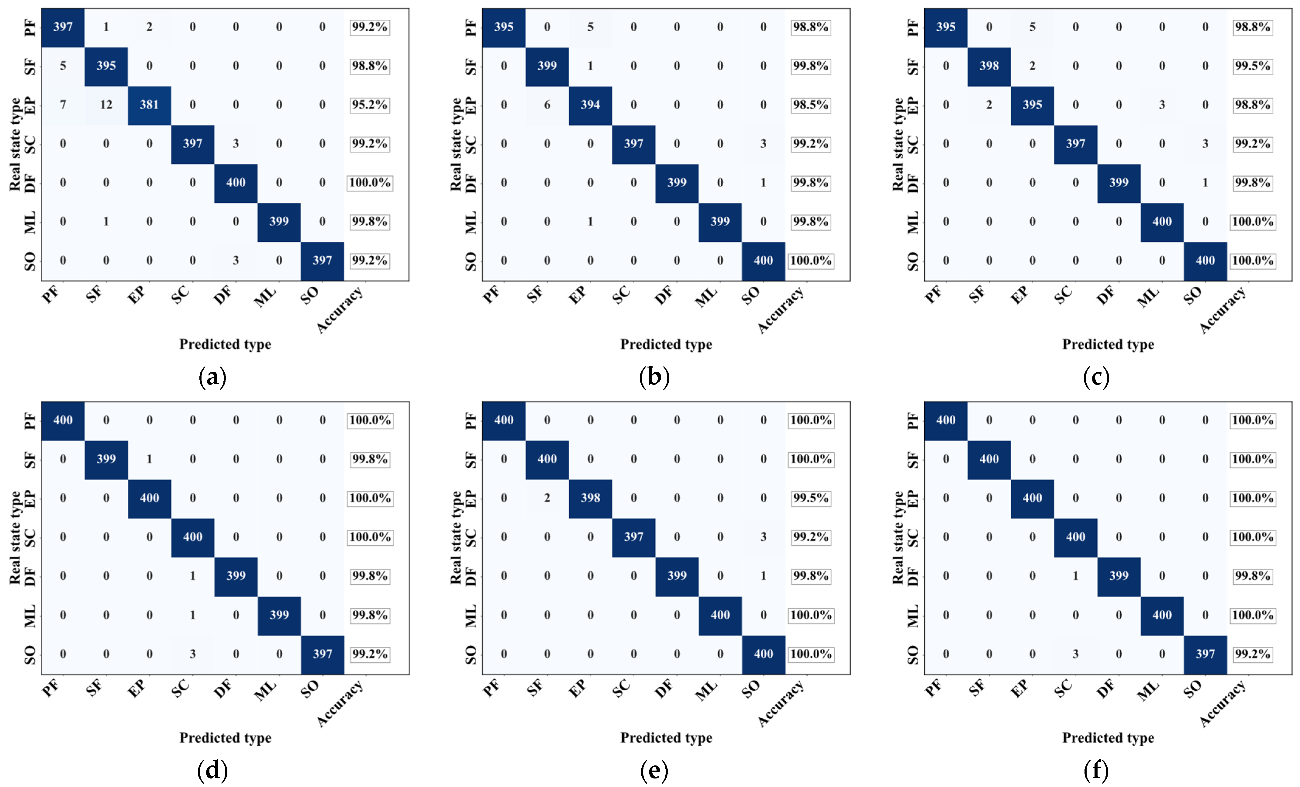 - The proposed model demonstrates excellent performance in dry gas seal fault classification, achieving an accuracy of 99.8571% on the test set. Under identical parameter settings, it significantly outperforms other 1D-CNN-based models, including CNN, ResNet, MA1D-CNN, ResNet-SE, and ResNet-CBAM, exhibiting both higher accuracy and superior convergence.