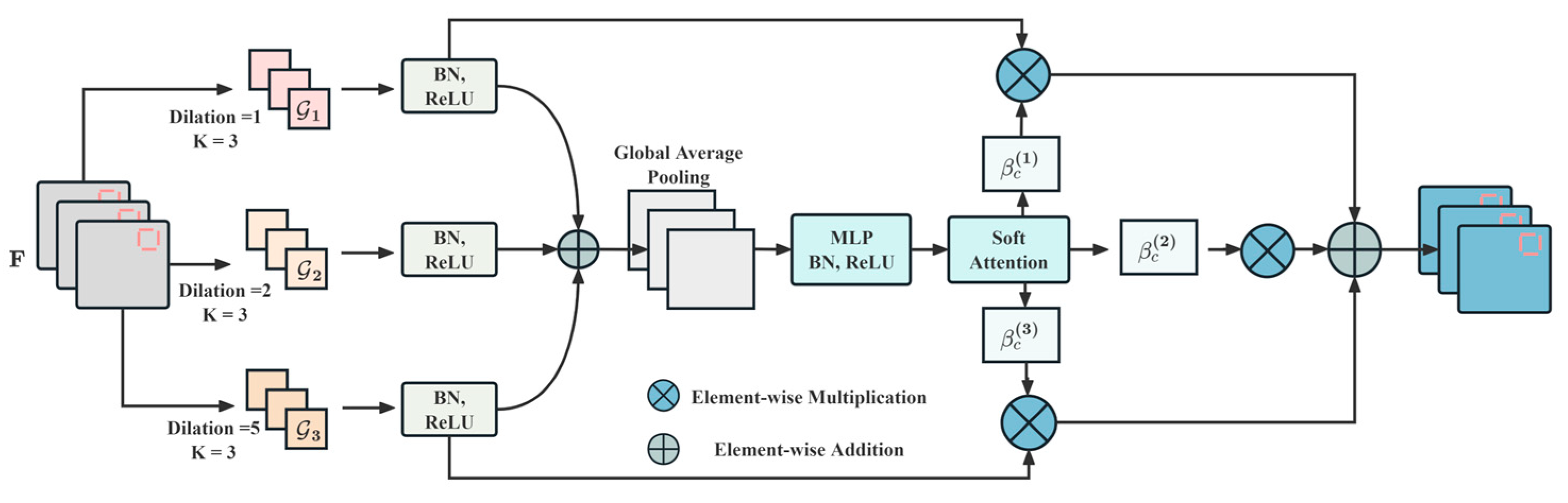 The multi-scale features extracted by the three paths need to be fused to obtain global statistical information on the input spectrum, providing a discriminative basis for the subsequent adaptive path selection. Element-wise addition fuses the feature responses from the three paths: