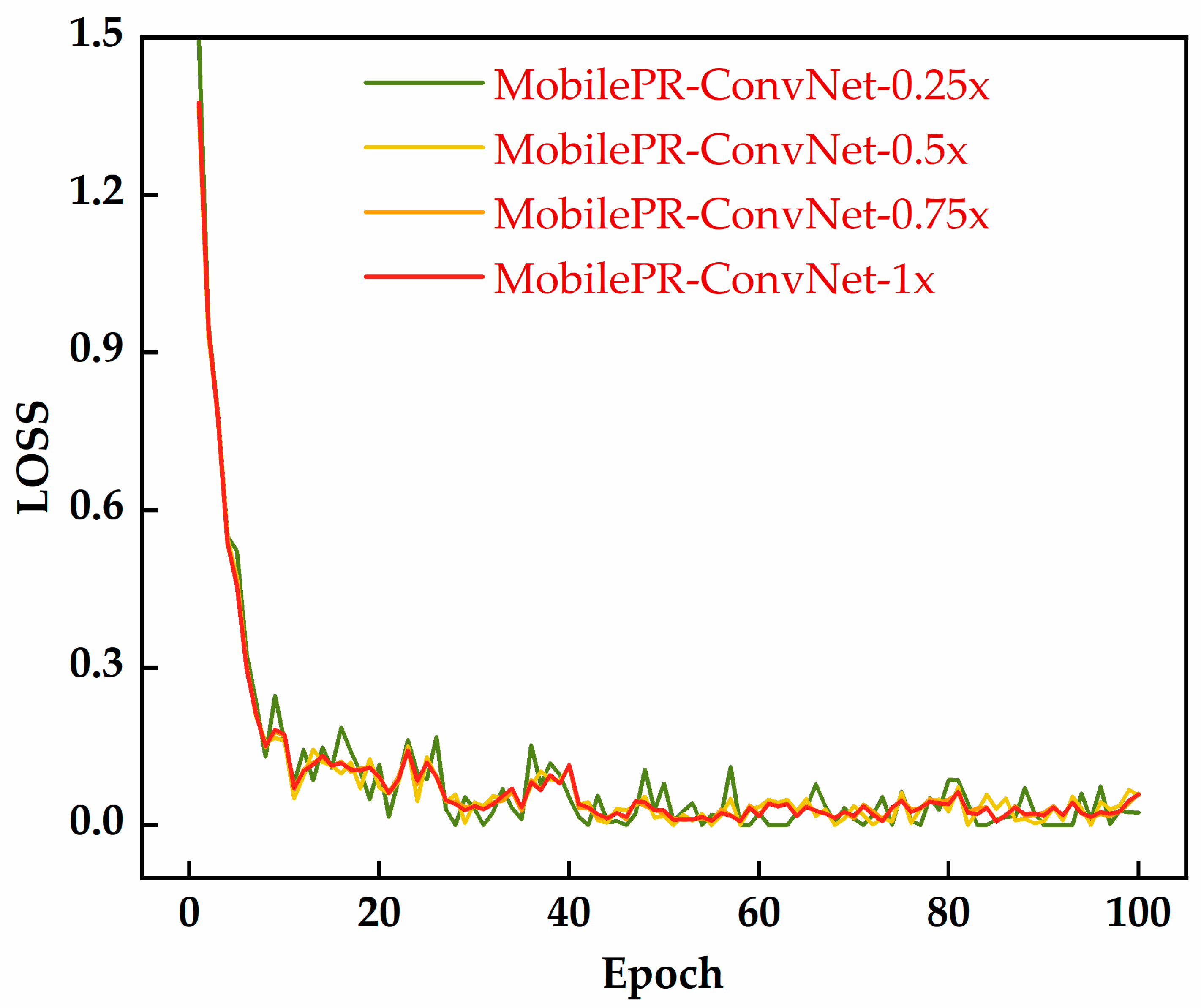 Figure 3, all four MobilePR-ConvNet variants exhibited stable convergence behavior during 100 training epochs, with loss values rapidly decreasing from 1.4–1.5 to 0.1–0.2 within the first 10 epochs. Among them, MobilePR-ConvNet-1.0× showed the smoothest convergence curve and minimal oscillations, benefiting from its larger network capacity and more comprehensive channel configuration. The confusion matrices shown in