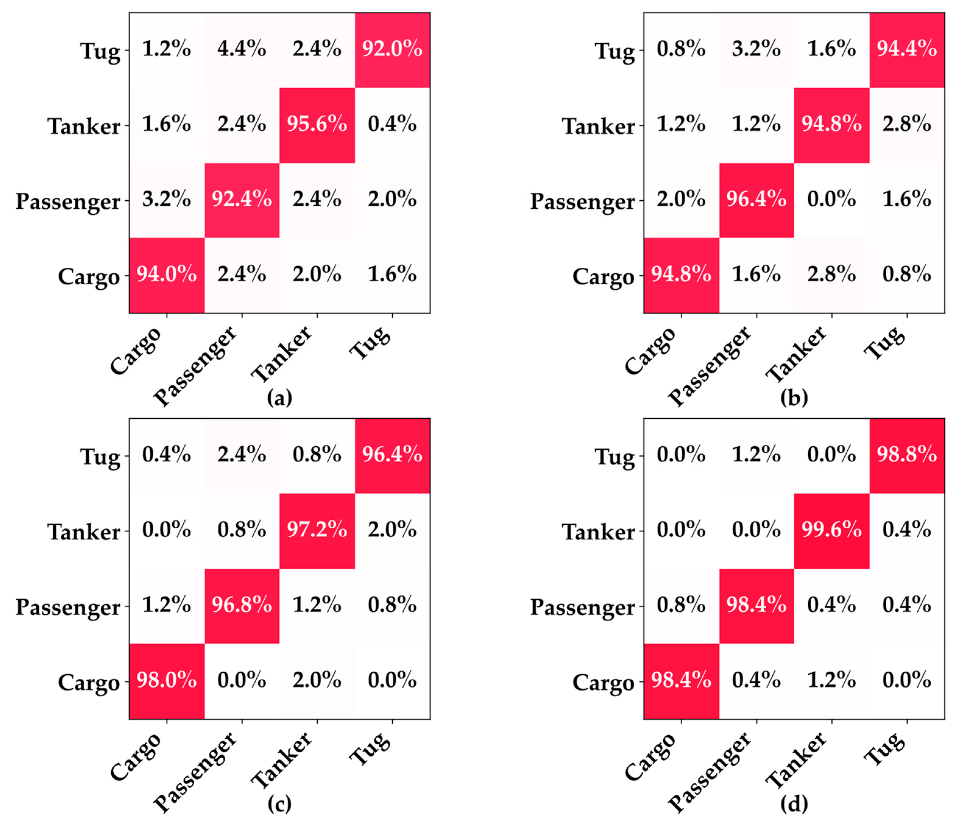 Figure 4 detail the classification performances of the four models in recognizing the surface vessel types through underwater acoustic signals, where all variants performed excellently on the four vessel types, Cargo, Passenger, Tanker, and Tug, with high diagonal values indicating a strong class discrimination capability. MobilePR-ConvNet-1.0× achieved the best overall performance, with the following class accuracies: Cargo: 98.4%; Passenger: 98.4%; Tanker: 99.6%; and Tug: 98.8%, validating the effectiveness of the standard width multiplier at maximizing the PR-Conv feature extraction capability.