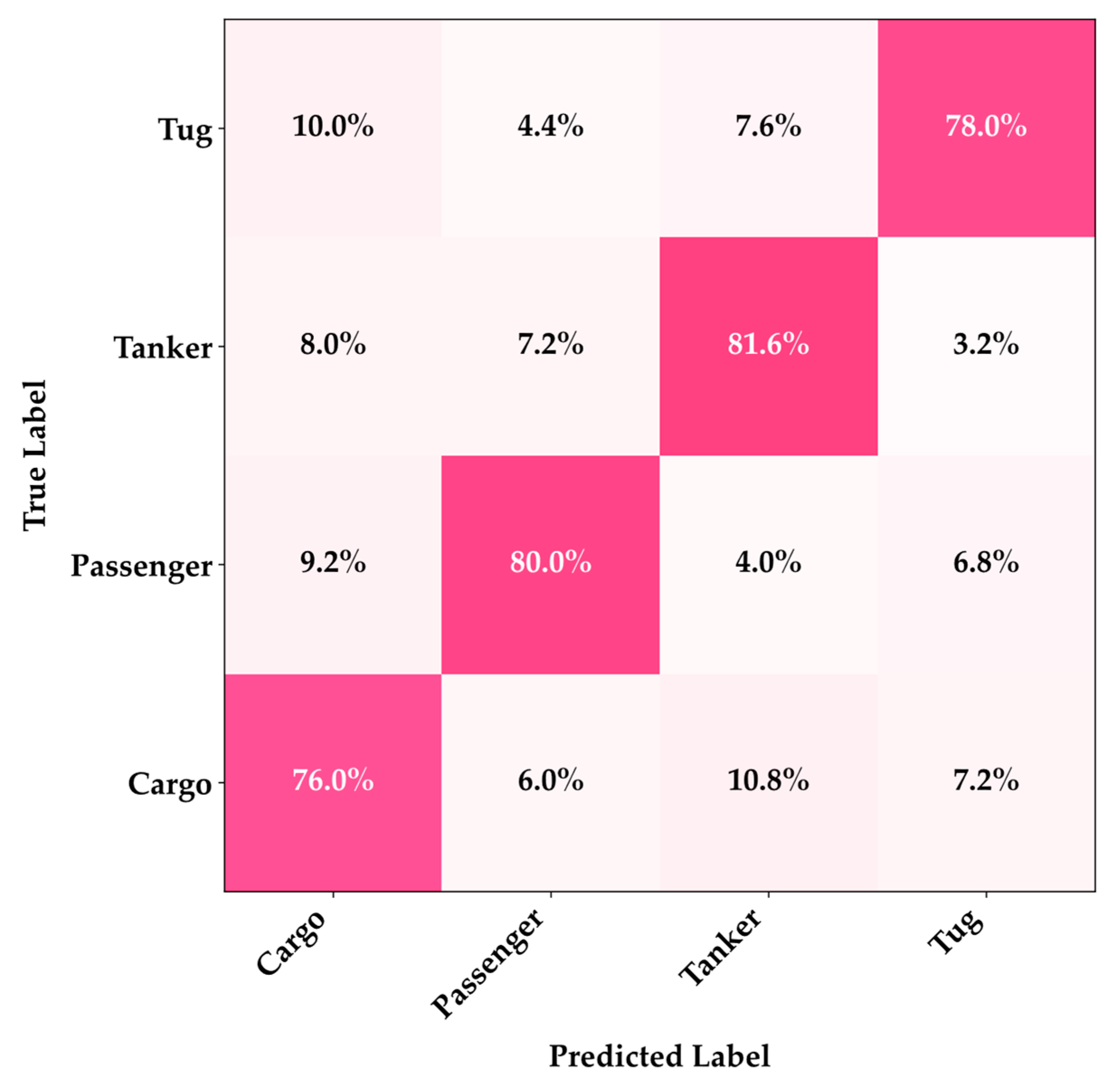 Figure 5, the confusion matrix reveals classification details under extreme noise conditions at a signal-to-noise ratio of 10 dB, where the Cargo and Passenger categories maintained high recognition rates of 76.0% and 80.0%, demonstrating excellent noise robustness, but the 10.8% cross-confusion between Cargo and Tanker as well as the 7.2% misclassification between Tug and Passenger indicate that strong noise interference masked the low-frequency features of large-vessel engines and the mid-frequency features of small-vessel propellers, leading to blurred acoustic feature boundaries. However, even the most lightweight variant maintained an acceptable recognition performance under extremely low signal-to-noise ratio conditions, demonstrating the effectiveness of the PR-Conv adaptive multi-scale feature extraction mechanism in complex acoustic environments. These results indicate that the proposed model series possesses strong anti-interference capabilities in real marine noise environments.