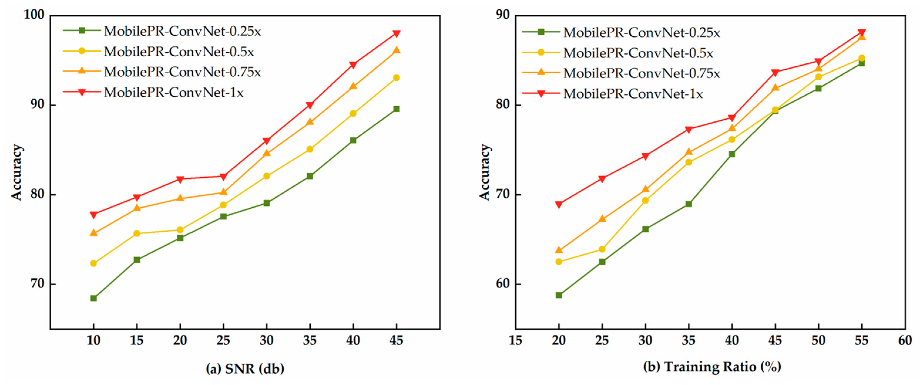 Figure 6a, all the MobilePR-ConvNet variants demonstrated excellent robustness performances in noisy environments. MobilePR-ConvNet-1.0× achieved 97.2% accuracy under high-signal-to-noise-ratio conditions of 45 dB, and as the signal-to-noise ratio decreased to the extreme noise level of 10 dB, the accuracy remained at 77.8%, while MobilePR-ConvNet-0.75× and MobilePR-ConvNet-0.25× achieved 75.2% and 68.1% accuracies, respectively, under the same conditions. As shown in