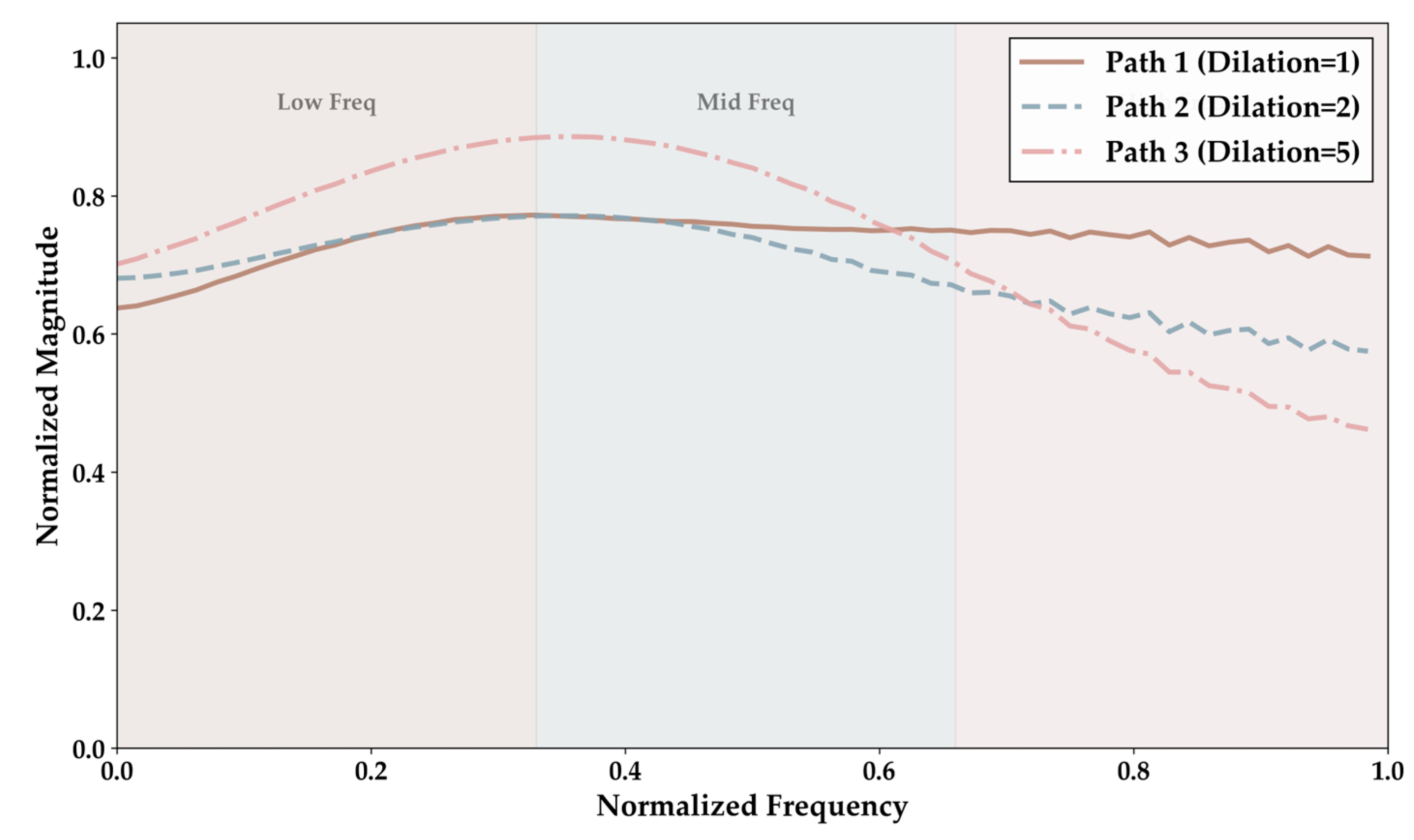 This section aims to demonstrate the frequency component characteristics captured by each of the three parallel paths in the PR-Conv mechanism through frequency response analysis. As shown in