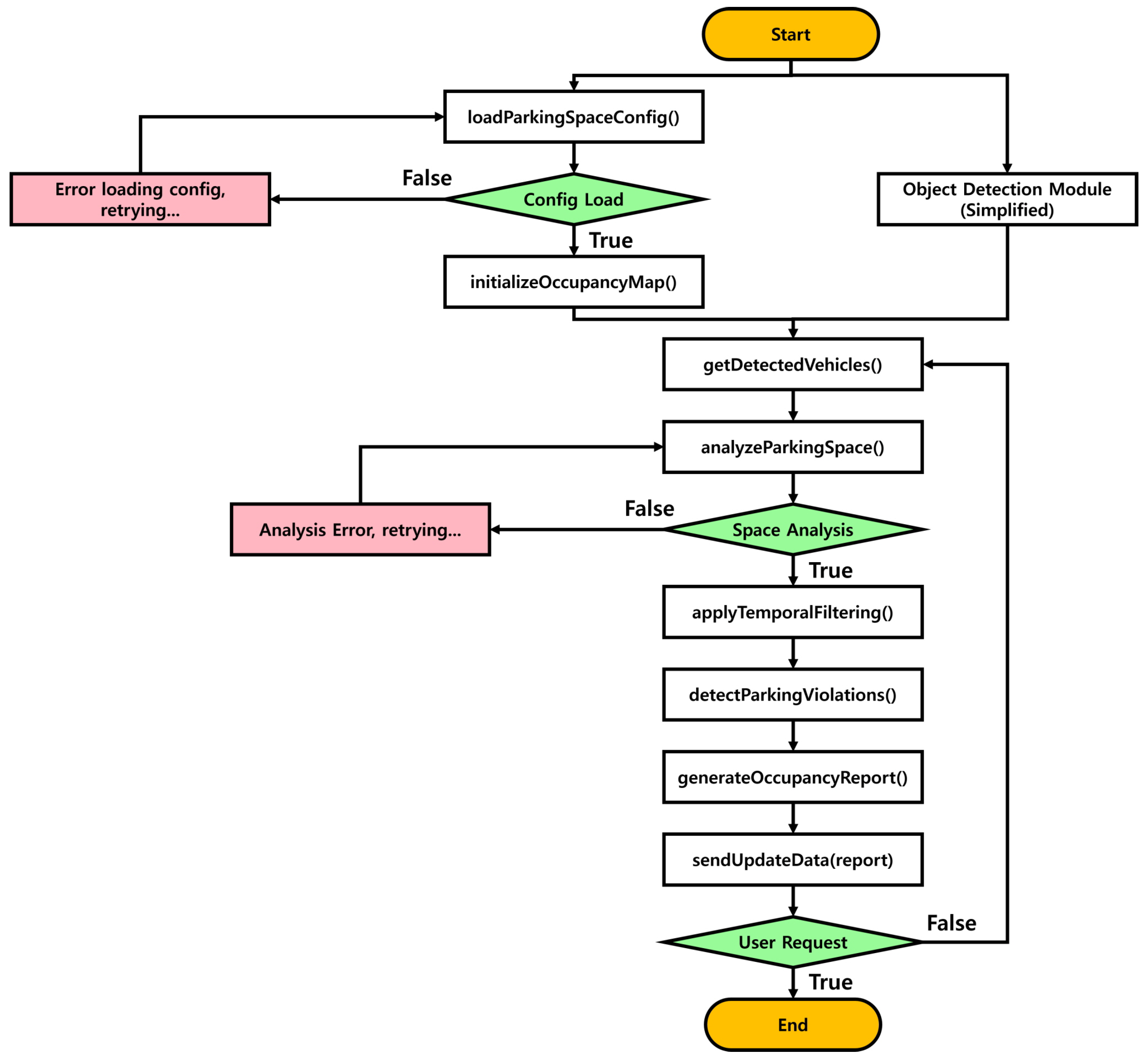 | Parking Space Analysis Module | Compares detected vehicle objects with predefined parking space information to determine occupancy. |
