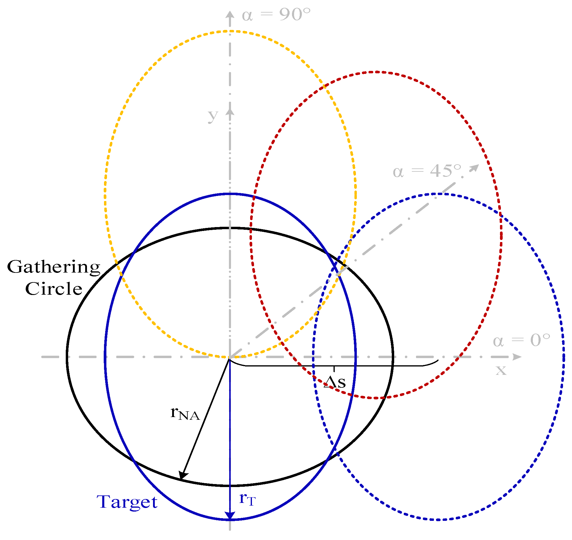 | φ′ | Angle between r′ and x-axis on the fiber end plane | rNA | Radius of the gathering circle defined by the OF field of view due to NA, on the target plane |