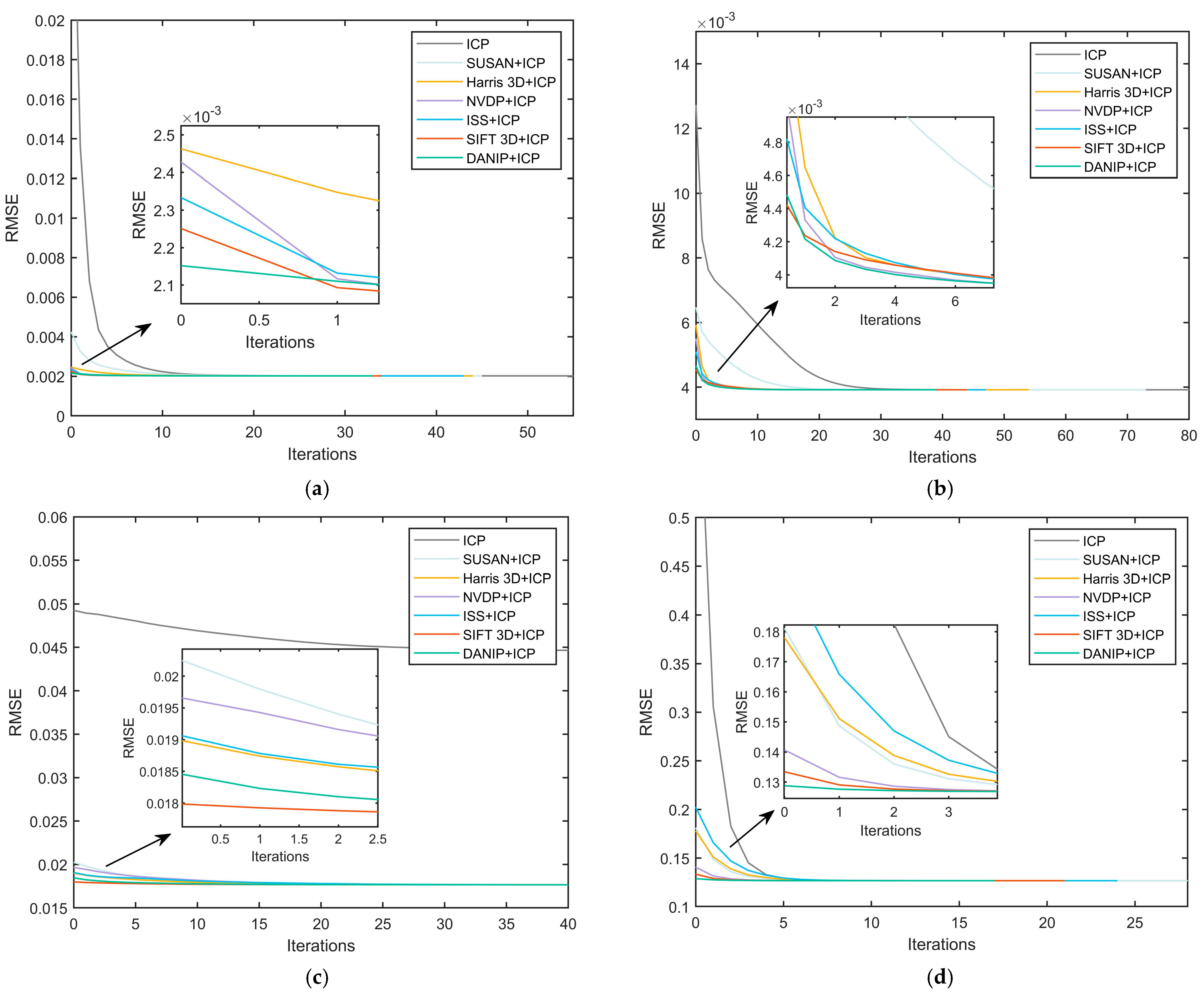 - A coarse-to-fine registration method combining DANIP and ICP is proposed. This method effectively avoids the local minima problem in the ICP algorithm, significantly improving convergence efficiency and computational performance. Under optimal conditions, the runtime is reduced by 66.93%, 78.01%, 75.48%, and 23.69% on the Stanford, Kinect, Queen, and ASL-LRD datasets, respectively.