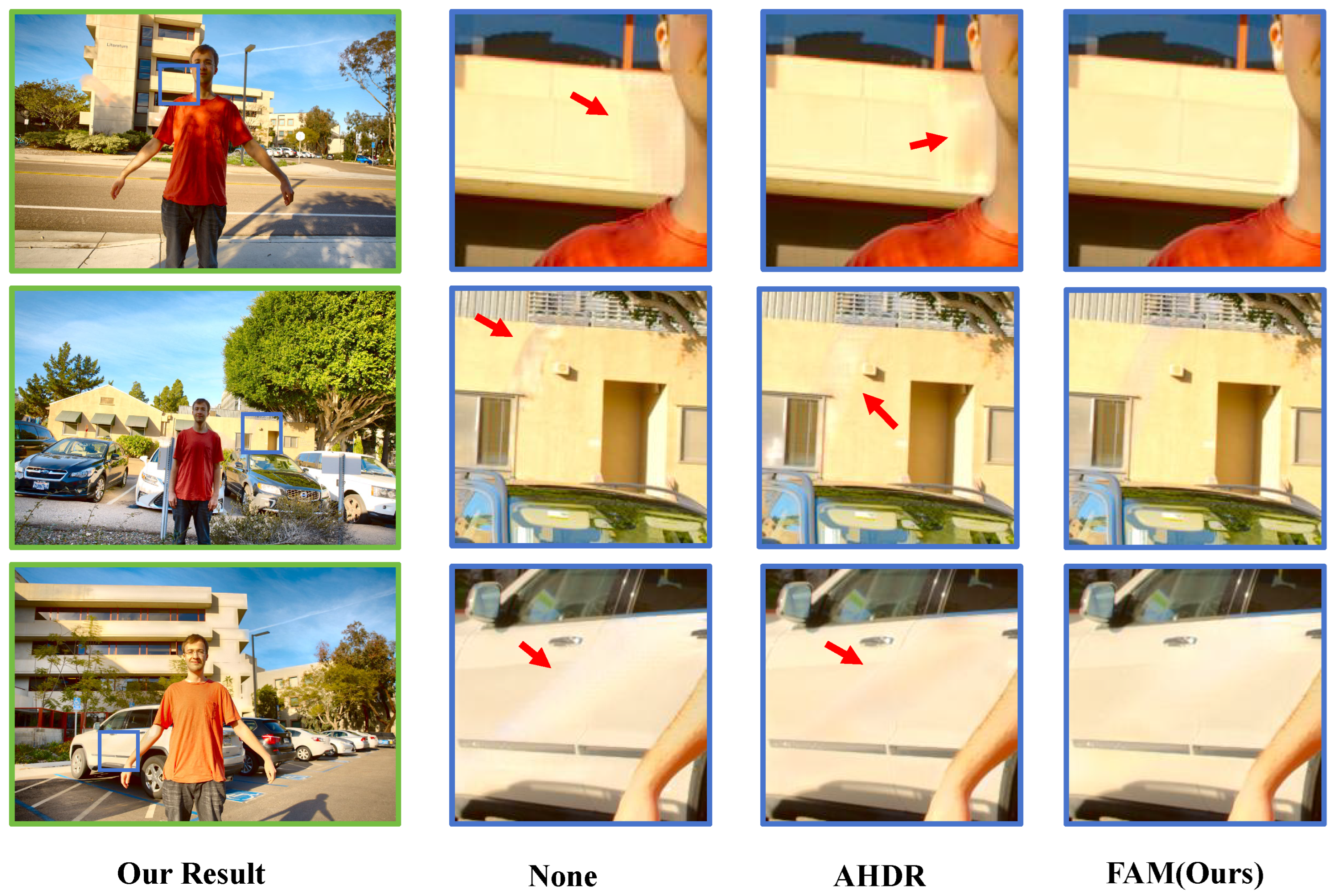 We propose a novel alignment method, FAM, in which the low-frequency branch captures large-scale motion through optical flow alignment, while the high-frequency branch refines local edges and textures, effectively suppressing ghosting.