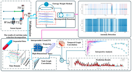 Figure 1 presents the overall framework of the proposed method. The framework encompasses sensor deployment, data pre-processing, interpretable prediction, and anomaly detection, thereby constituting a complete workflow for gas time-series processing and analysis. First, in the sensor-deployment stage, T0, T1, and T2 gas sensors, together with a wind-speed sensor, are deployed to acquire multi-source gas-related data. Next, the Entropy Weight Method (EWM) is employed to optimise the key parameters (e.g., α and ) of the decomposition–denoising procedure, thereby enabling effective noise suppression and modal decomposition of multi-channel gas time-series data and providing high-quality inputs for downstream processing. On the basis of the decomposed data, inputs are fed to the CrossGNN model. For sequential data, features are first analysed in the time and frequency domains; the data are then mapped to a high-dimensional space and processed by an interpretable Cross-Interaction Refinement Graph Neural Network (interpretable CrossGNN) that incorporates node graph convolution and temporal graph convolution. These components capture, respectively, inter-sensor correlations and temporal dependencies, thereby enabling accurate prediction of gas concentration and the generation of prediction outputs. In parallel, an interpretability module quantifies the contribution of each feature to the predictions, thereby enhancing model transparency. Finally, on the basis of the processed data, an anomaly-detection module is applied to identify sudden abnormalities in gas signals, providing comprehensive support for coal-mine gas safety monitoring and early warning.