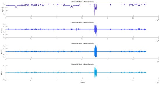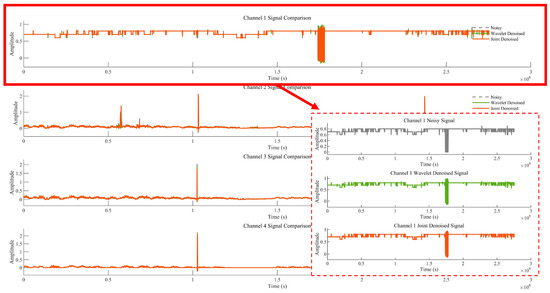 Equation (14) is the wavelet reconstruction formula, which recombines the processed high-frequency detail coefficients with the original low-frequency approximate coefficients to restore the time-domain signal (i.e., the denoised signal). The db4 wavelet basis is selected for wavelet denoising, which follows a three-step process—“decomposition–thresholding–reconstruction”—to specifically suppress high-frequency noise and separate signal components of different frequencies. When combined with MVMD, MVMD first decomposes the signal into modal components with higher purity; wavelet denoising then performs refined denoising on these components.