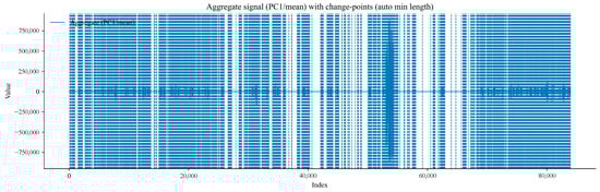 The Pruned Exact Linear Time (PELT) algorithm with the ‘l2’ model is used to detect mean change points in the multivariate matrix X. PELT is re-run on the first-order difference to capture slope changes, and the change points are merged. During detection, the penalty terms are adaptive to the sample length and dimension, as shown in Equation (30):