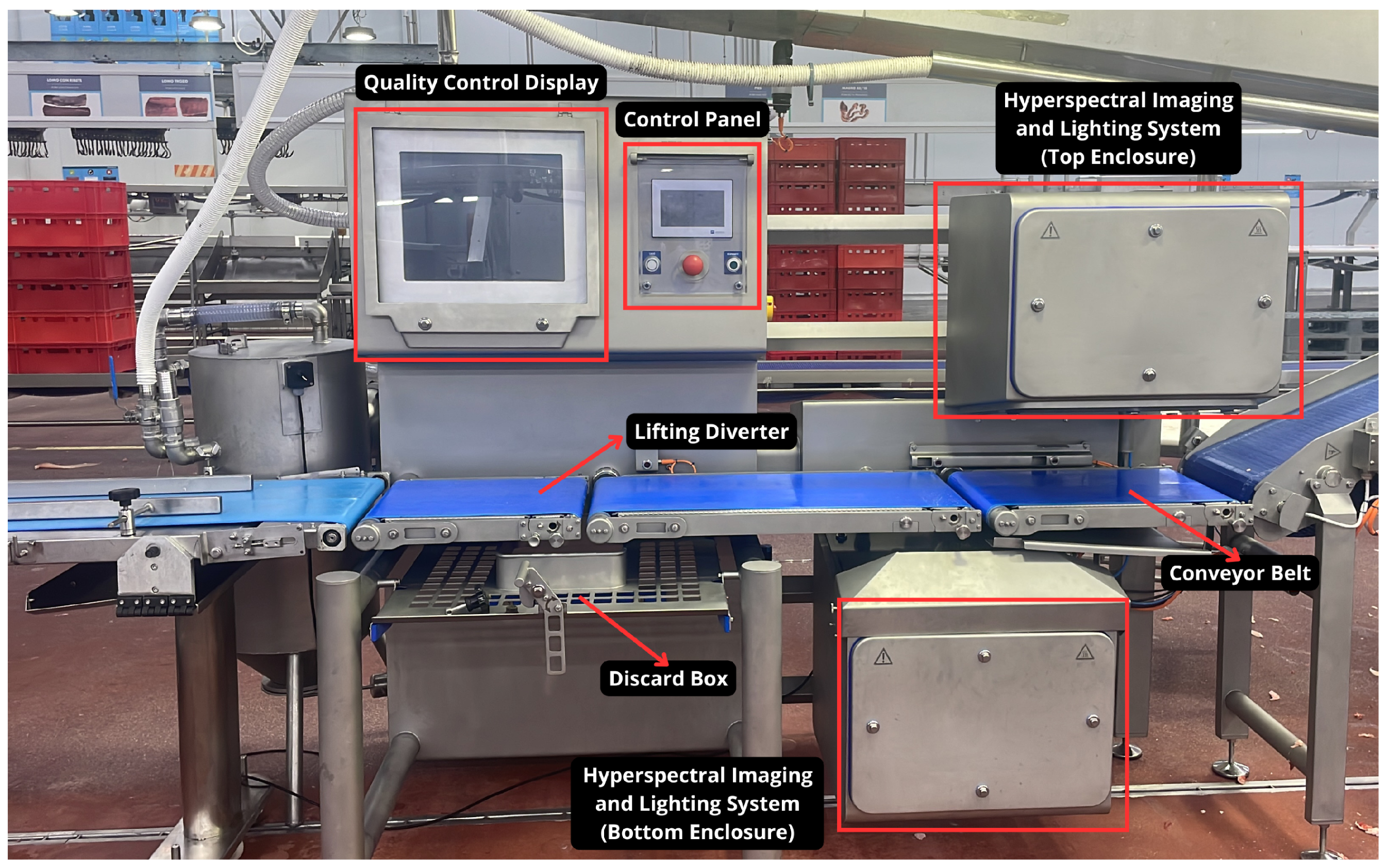 The pork belly pieces are transported between the slaughterhouse and the packing area on a conveyor belt. To identify potential contaminants that may have entered during this process, we set up a hyperspectral camera, together with a halogen lighting system, above the conveyor belt to capture images of the pork belly pieces as they move along the belt.