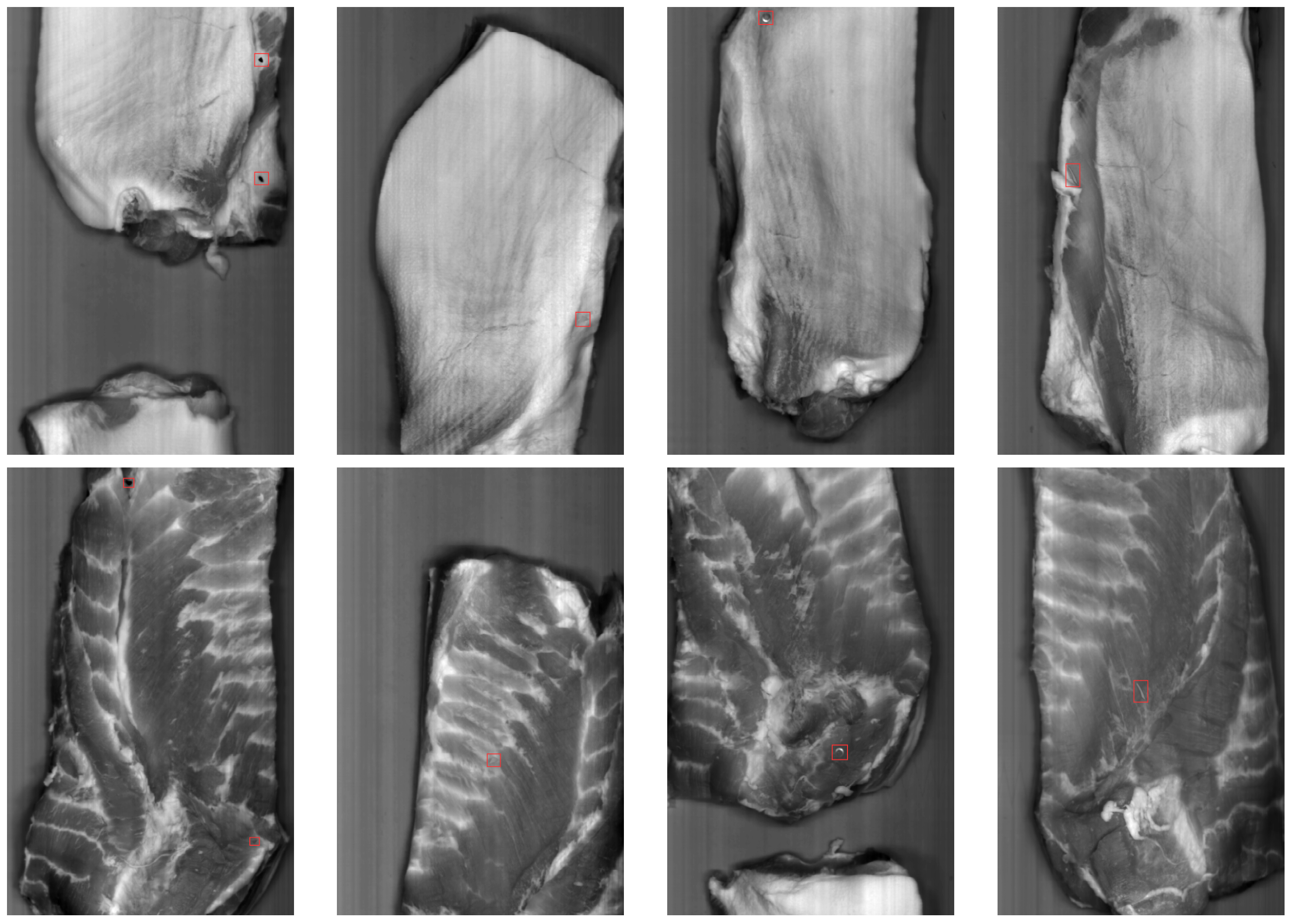 Figure 2. The contaminants included in this study were proposed by our industrial partner based on materials identified during human quality control processes and through client complaints received during routine operations. These contaminants, therefore, represent real-world foreign objects commonly encountered across multiple stages of meat processing workflows, such as slaughterhouses, boning halls, and retail preparation rooms. For example, PA fragments typically arise from wear of guide rails and gears in deboners and slicers; PP debris originates from packaging items such as tray inserts and straps; PU residue can be shed from roller coverings, knife handles, and elastomeric scrapers used for product handling and cleaning; Nitrile contaminants are primarily linked to protective equipment such as gloves; wood splinters originate from pallets and crate slats; paper and cardboard fibres come from packaging material and labels; Teflon flakes can result from degradation of non-stick coatings on heat-seal bars and chutes; and metal fragments are most often shed from blades, hooks, and fasteners in cutting, trimming, and conveying equipment, as well as from tool wear during maintenance activities. All these materials were selected in accordance with regulatory frameworks designed to ensure safety, compliance, and controlled usage within the meat processing industry.