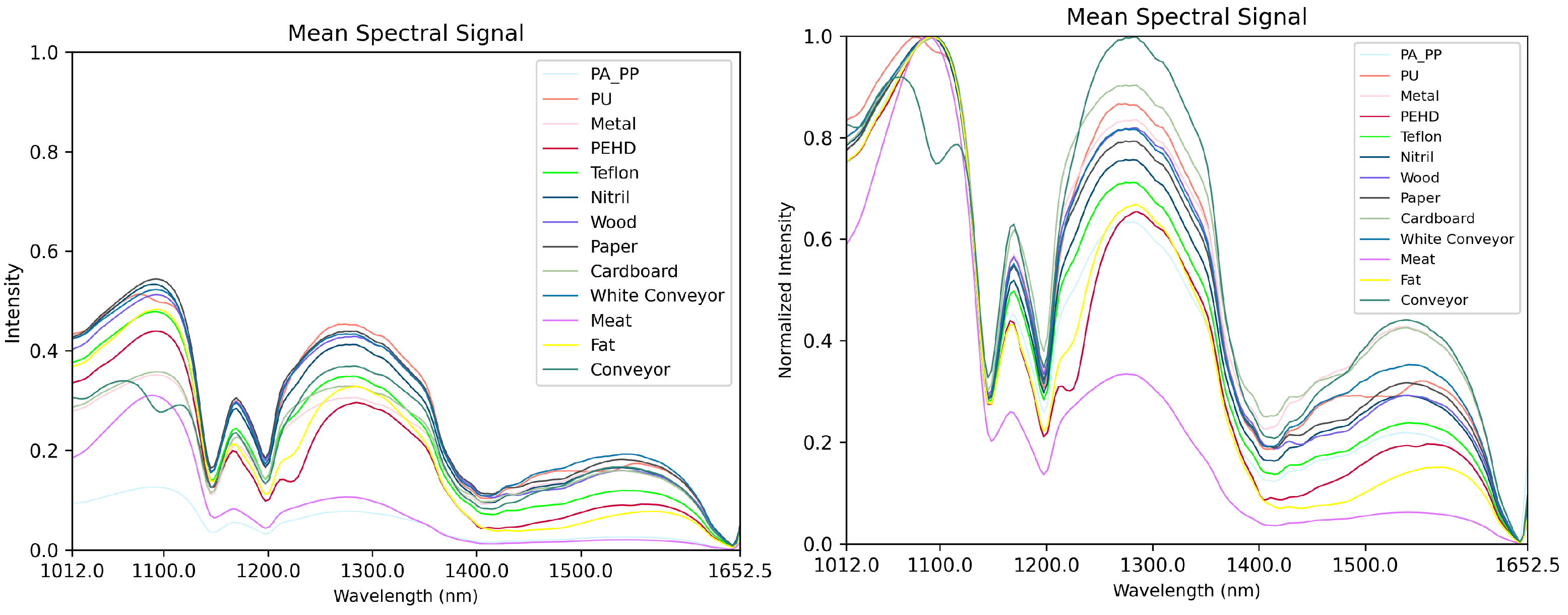Figure 8, demonstrating that after normalization, intra-class variability was reduced for fat, meat, and conveyor belt samples. Shadows and fine illumination differences were also attenuated, making the model more robust to variations in sensor temperature and exposure settings. Without normalization, there was a higher variability within each class, which would require more annotated samples to obtain better generalization. Without this step, distinguishing between samples of meat and fat became more challenging in the presence of shadows. Spectral normalization thus simplified the annotation task, reducing the need for extensive data labelling.