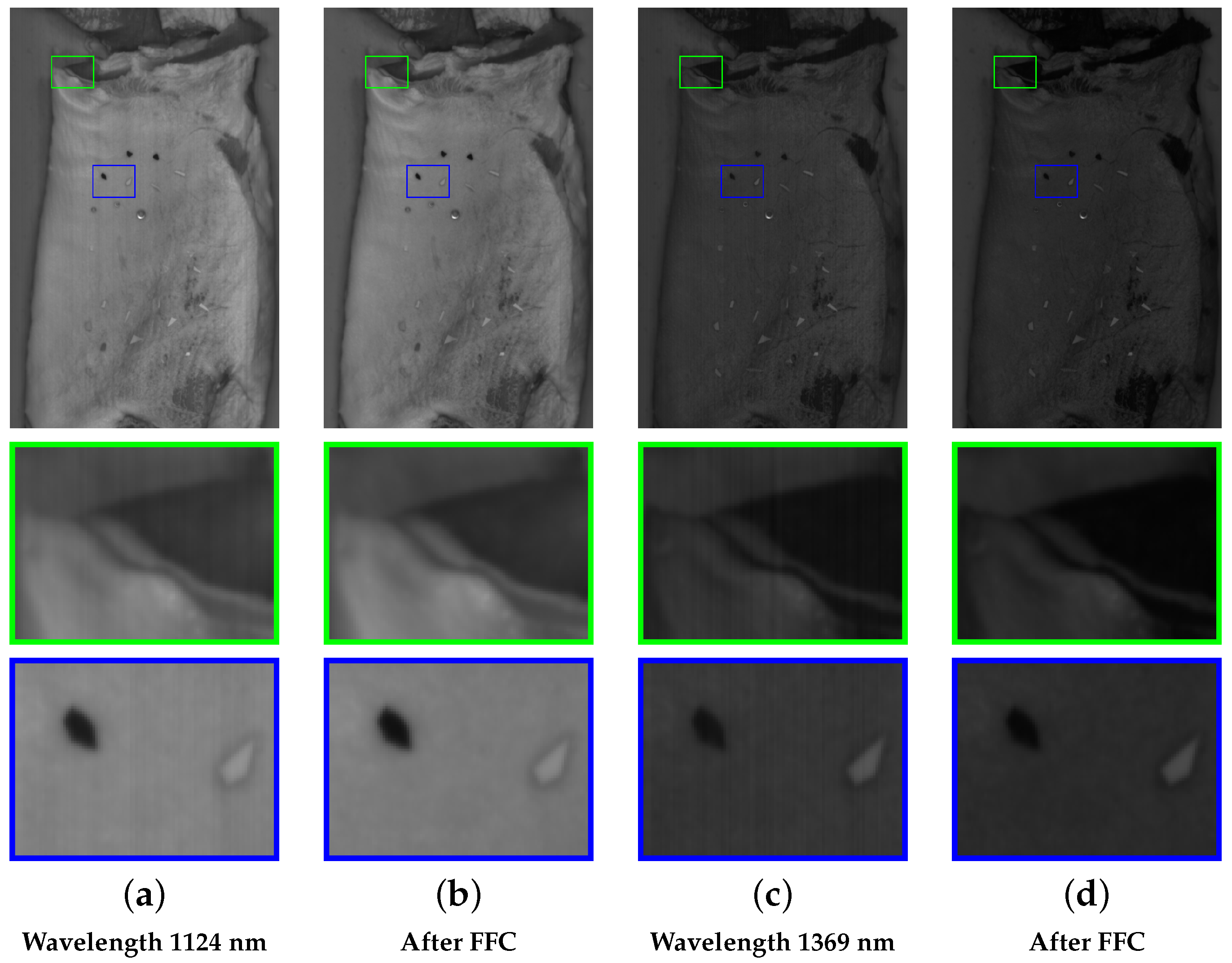 Figure 7 illustrates an example of a hyperspectral image with visible fixed-pattern noise in columns (a,c), appearing as vertical stripes. Columns (b,d) depict the results after applying flat-field correction, with a reduced noise pattern. The crops highlight how the noise pattern varies across different wavelength images in columns (a,c).