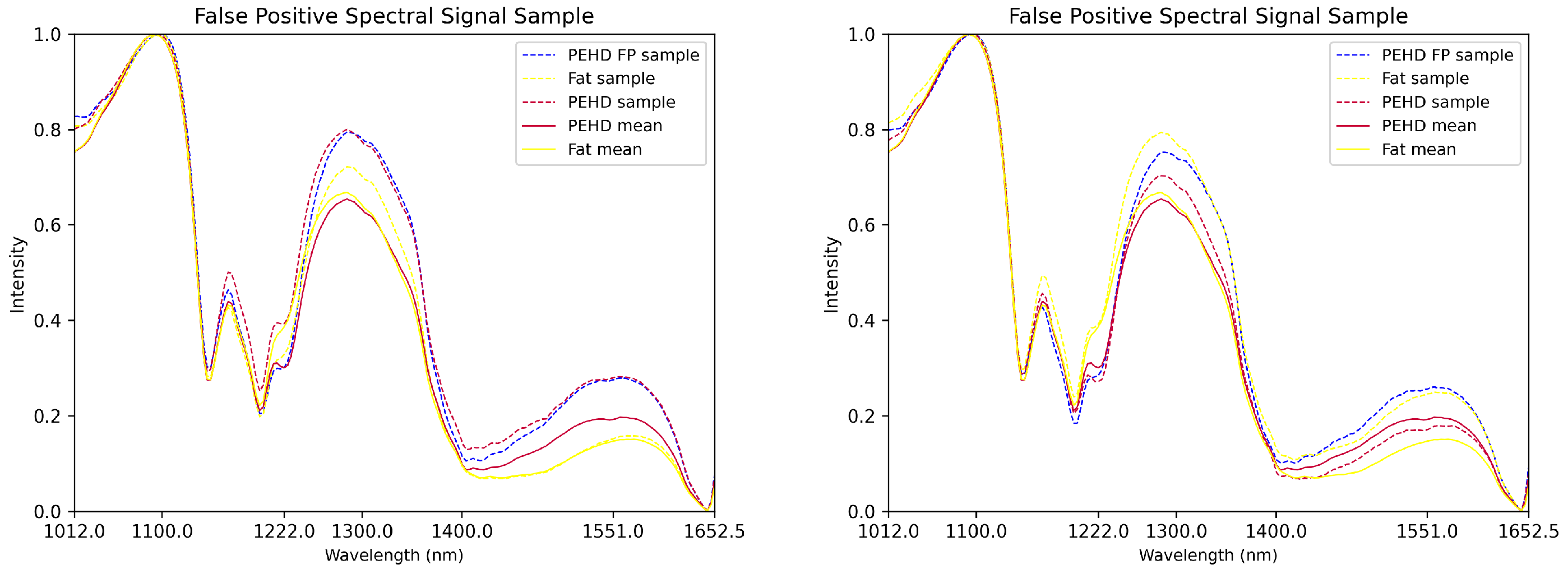 Figure 10 illustrates cases where spectral signatures of PEHD false positives closely resembled those of true PEHD contaminants. Similarly, PEHD and fat sometimes exhibited extremely similar spectral curves, complicating their separation. This was similarly observed for PA-PP. Therefore, in addition to erosion, three pixel-wise post-processing conditions were applied to separate true from false positives based on their spectral characteristics, especially for PEHD and PA-PP: