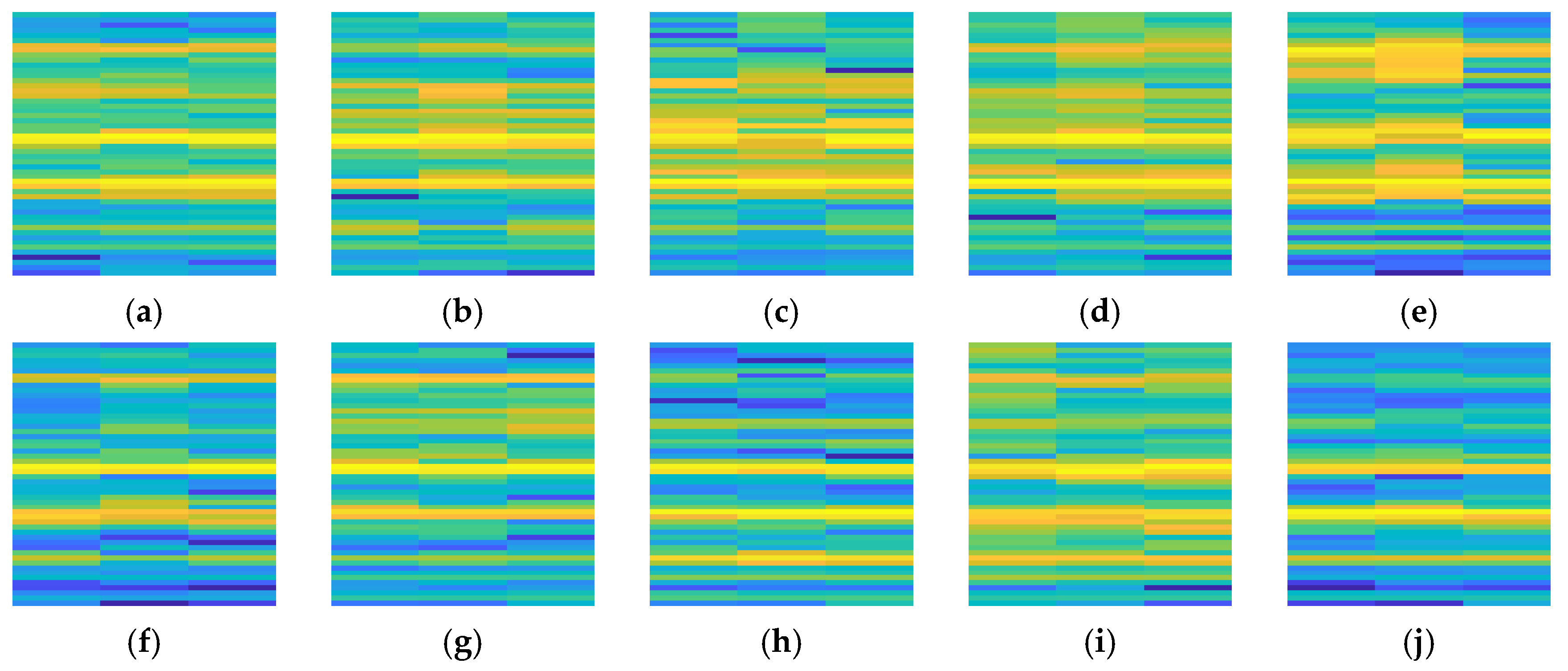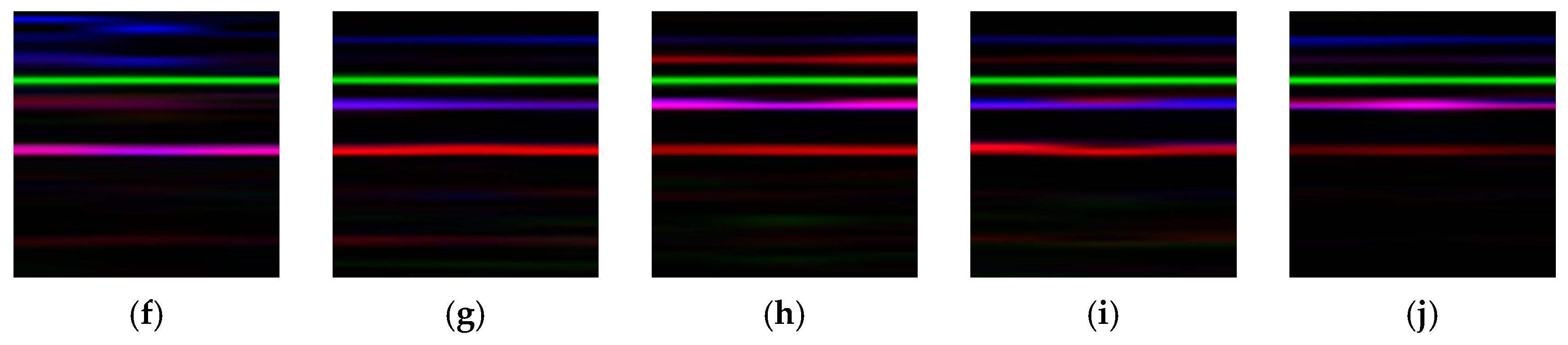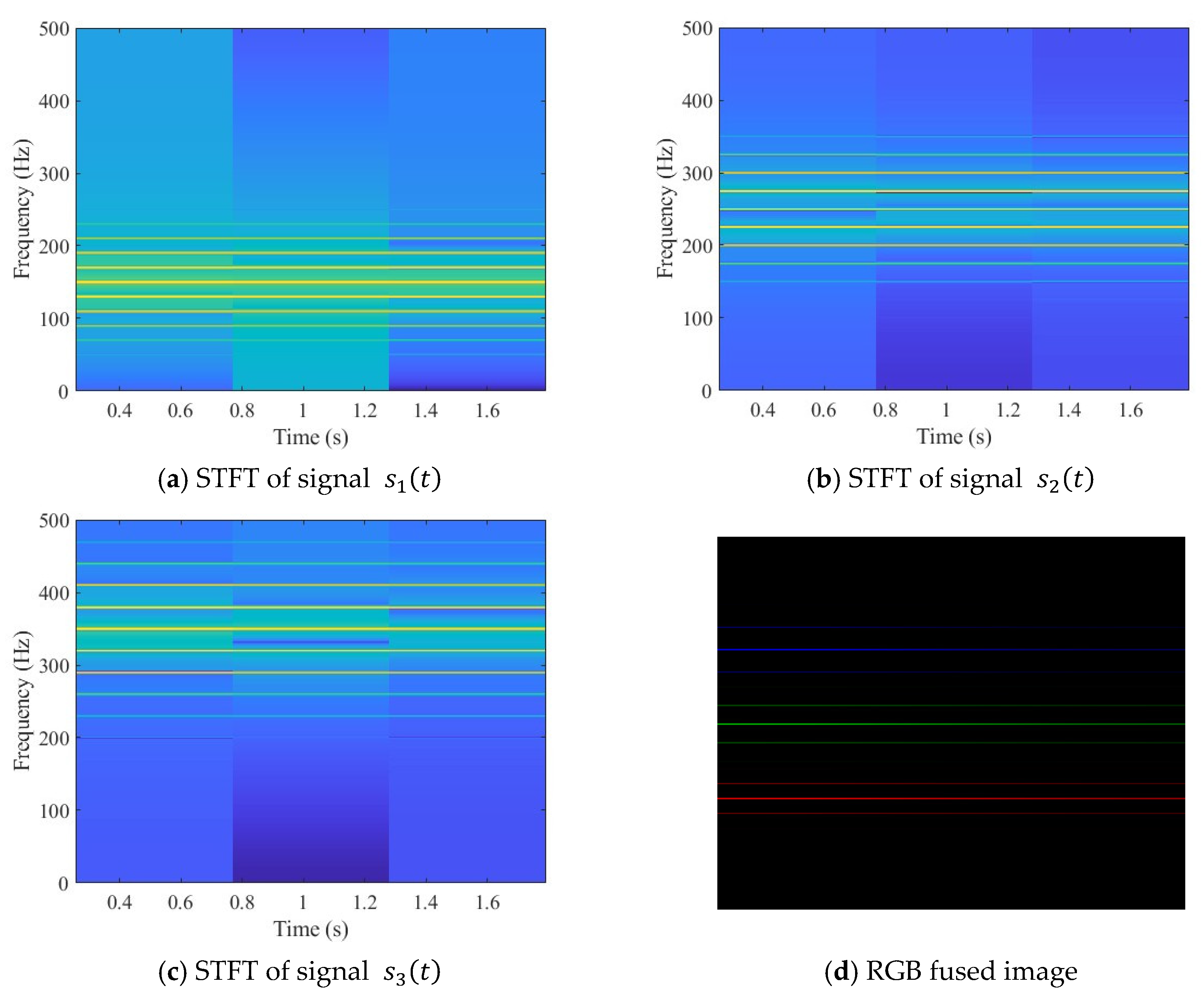 - RGB Image Construction: Each signal segment is transformed into a grayscale spectrogram using STFT and discretized into a grayscale matrix. The matrix amplitudes are then normalized to a 0–255 range. The grayscale matrices of the individual signals are assigned to the R, G, and B channels, respectively. Finally, the three matrices corresponding to the same time interval are combined to form a single RGB image.