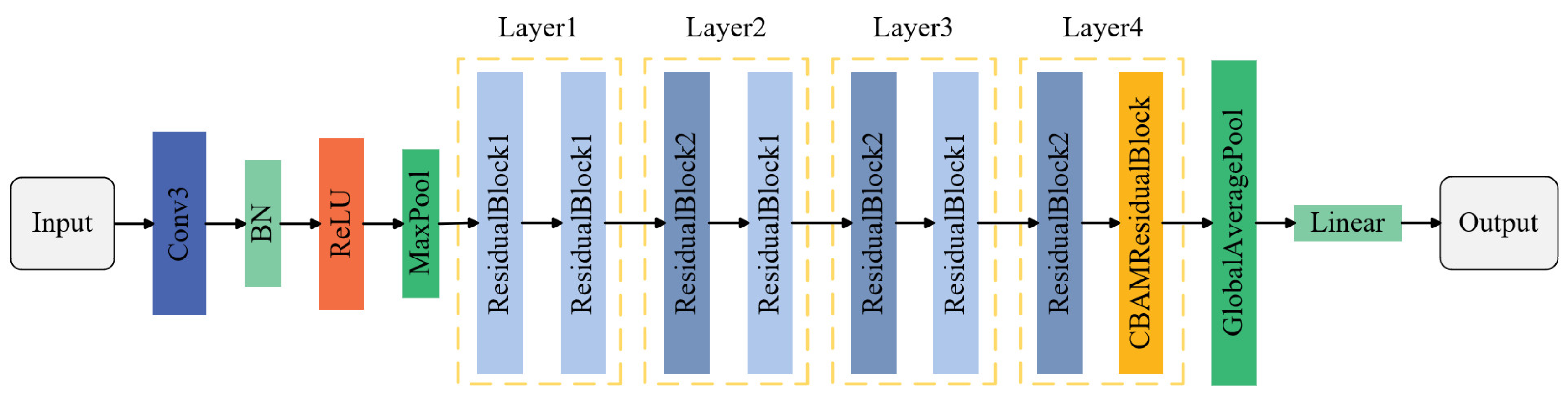 - Based on the ResNet-18 architecture, an improved approach incorporating a dual attention mechanism was proposed, and a novel residual module integrating both channel and spatial attention mechanisms was designed. Comparative experiments verified the network’s superior capability in feature extraction and classification performance.