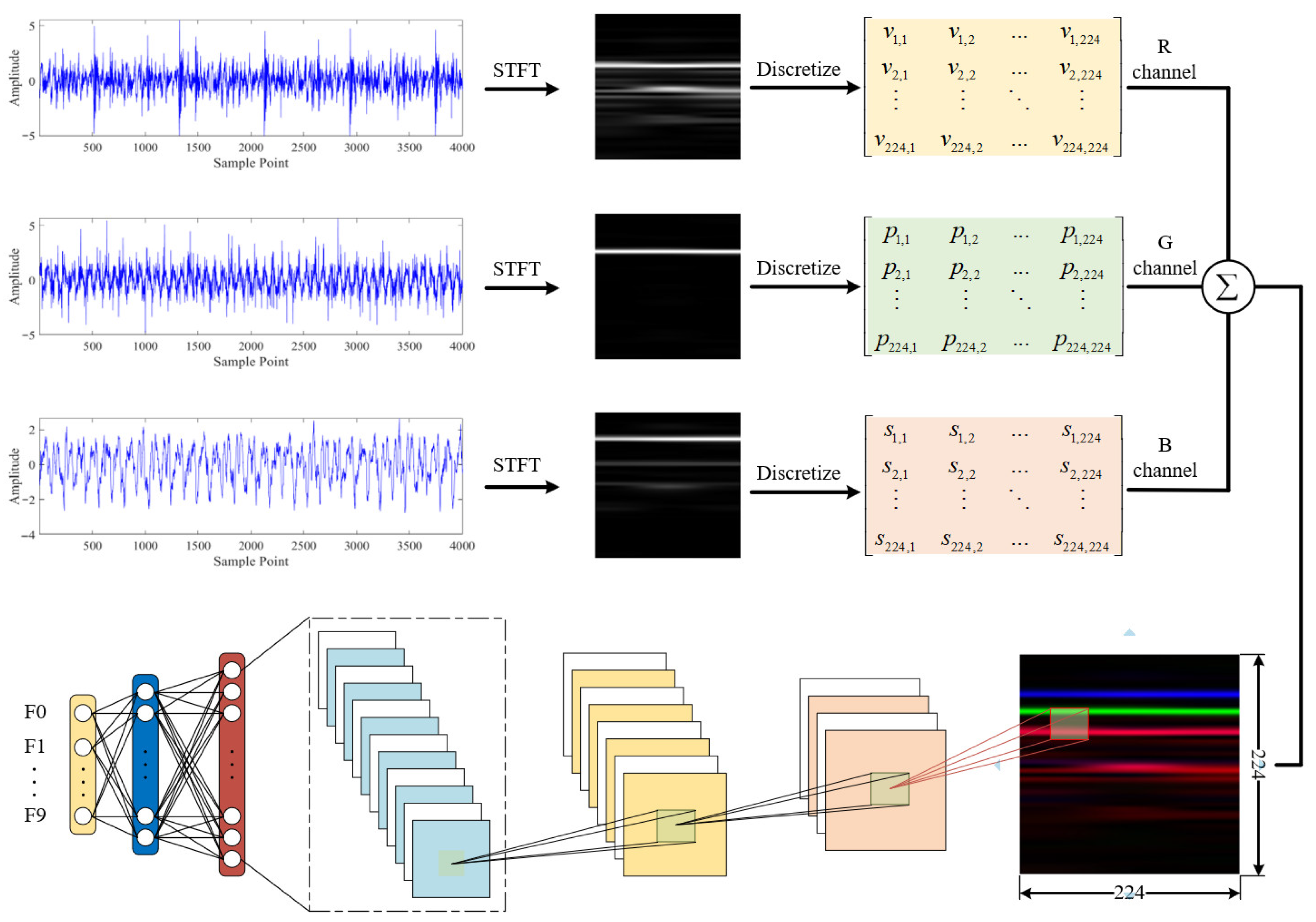 - In this paper, time-frequency features of vibration, pressure, and sound signals are extracted to construct uniform-scale RGB images, enabling visualization of multi-source data fusion and adapting to the input requirements of convolutional neural networks. Experimental results demonstrate that this fusion strategy significantly improves fault identification performance compared with single-signal input.