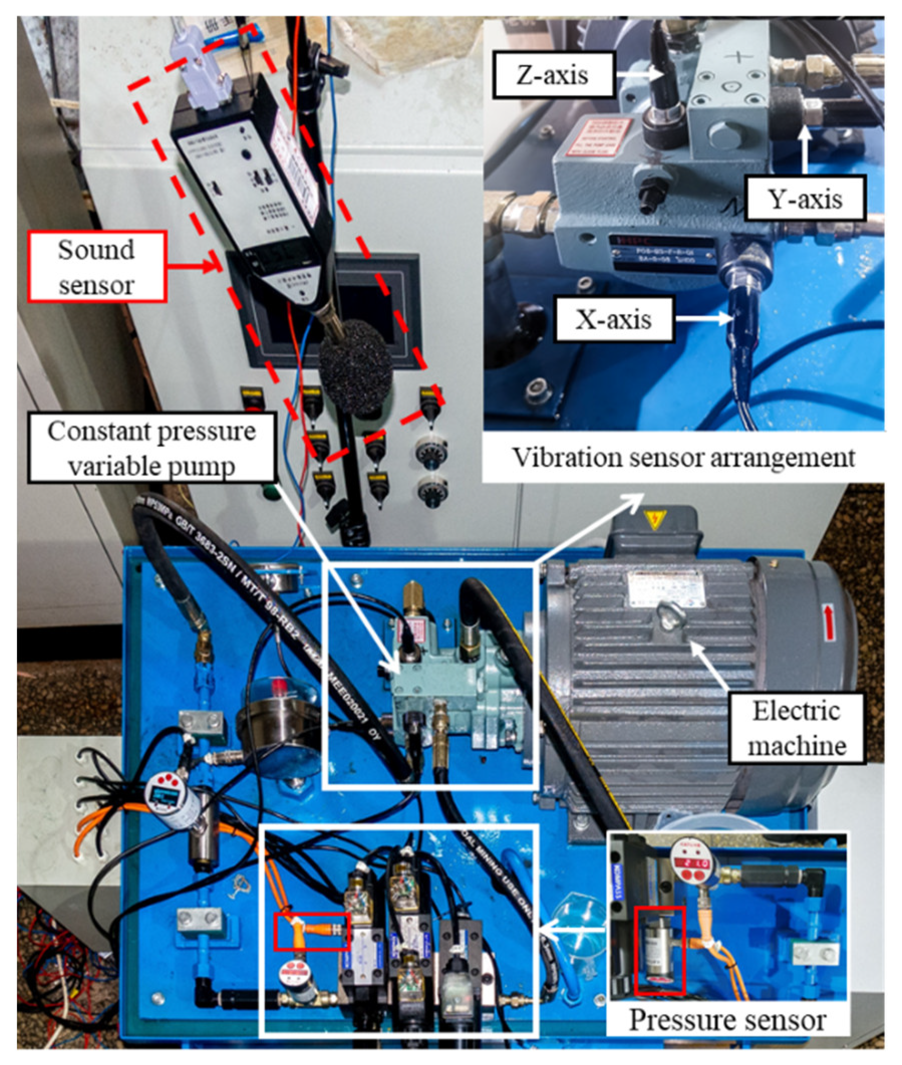 - Data Collection: Operational data of the hydraulic pump under various operating conditions are acquired using sensors—such as vibration, pressure, and sound—placed at key locations on the pump.