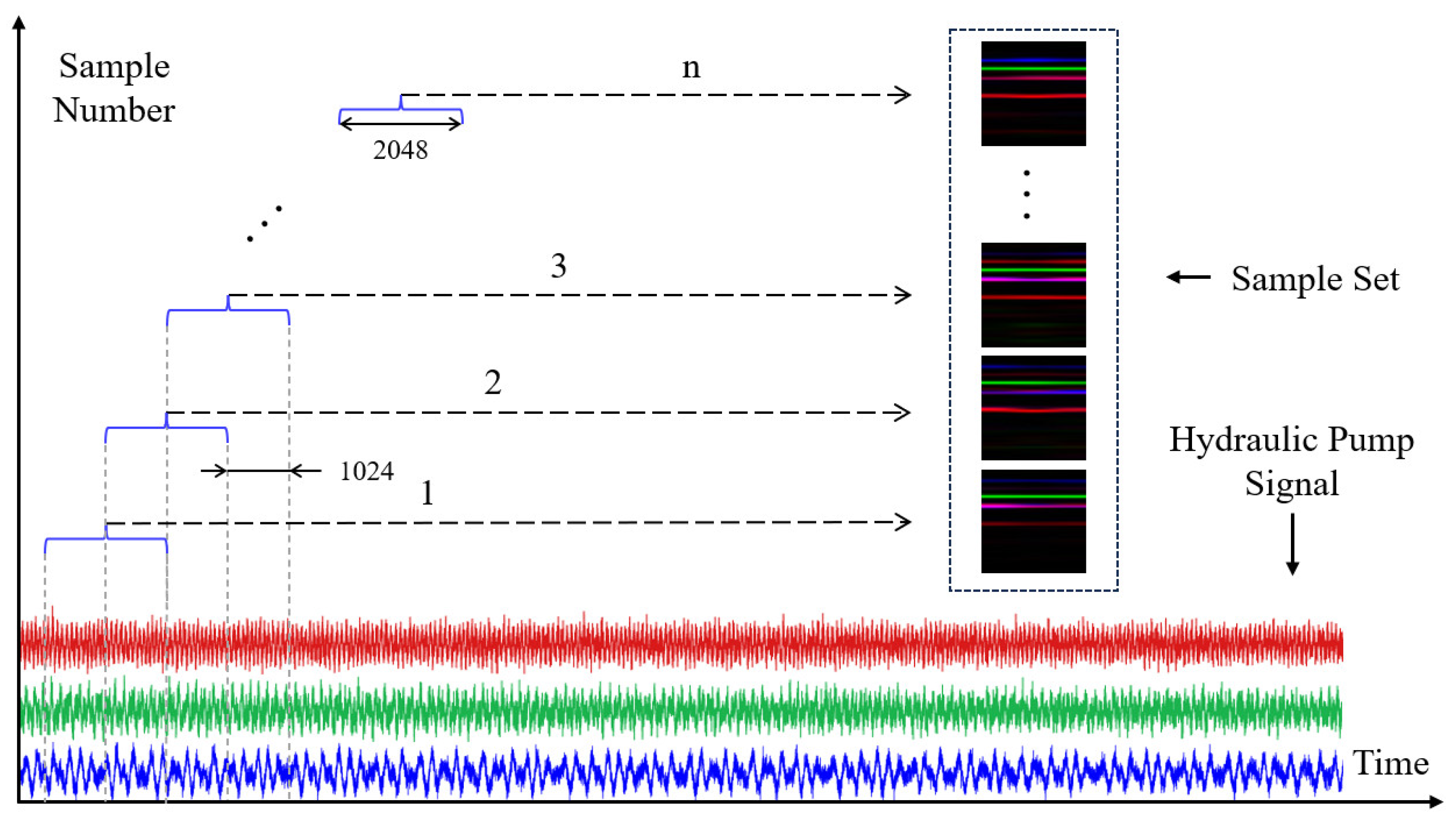 - Model Training: The resulting RGB images are fed into a convolutional neural network, with the dataset split into training and testing sets in appropriate proportions, to train the CNN model to recognize various fault types of the hydraulic pump.