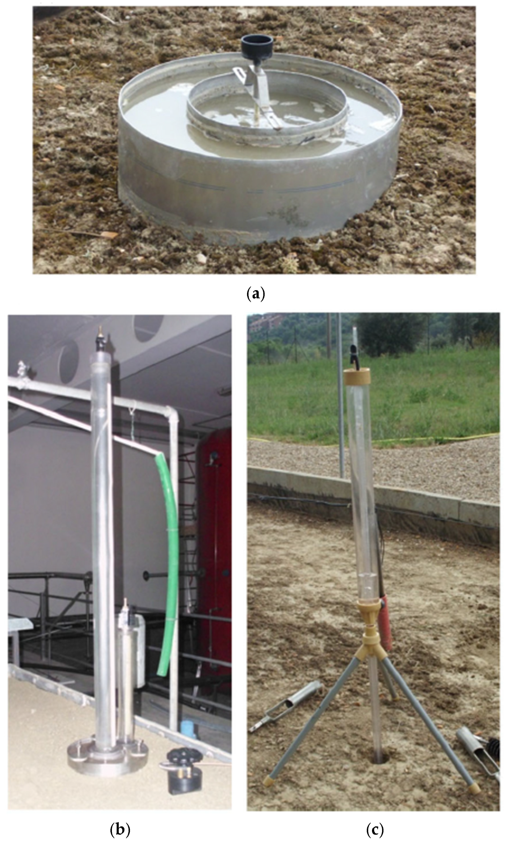 - Angulo-Jaramillo, R.; Vandervaere, J.; Roulier, S.; Thony, J.; Gaudet, J.; Vauclin, M. Field measurement of soil surface hydraulic properties by disc and ring infiltrometers: A review and recent developments. Soil Tillage Res. 2000, 55, 1–29. [Google Scholar] [CrossRef]