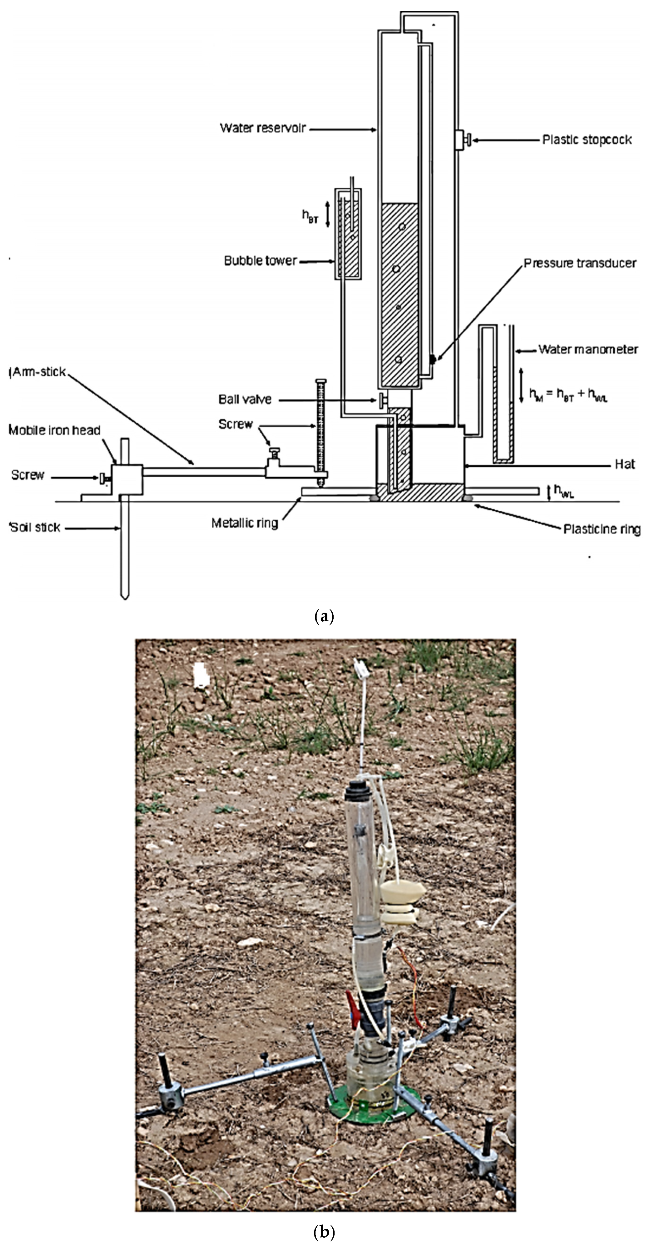 - Moret-Fernández, D.; González-Cebollada, C.; Latorre, B.; Pérez, V. A modified hood infiltrometer to estimate the soil hydraulic properties from the transient water flow measurements. J. Hydrol. 2015, 530, 554–560. [Google Scholar] [CrossRef]