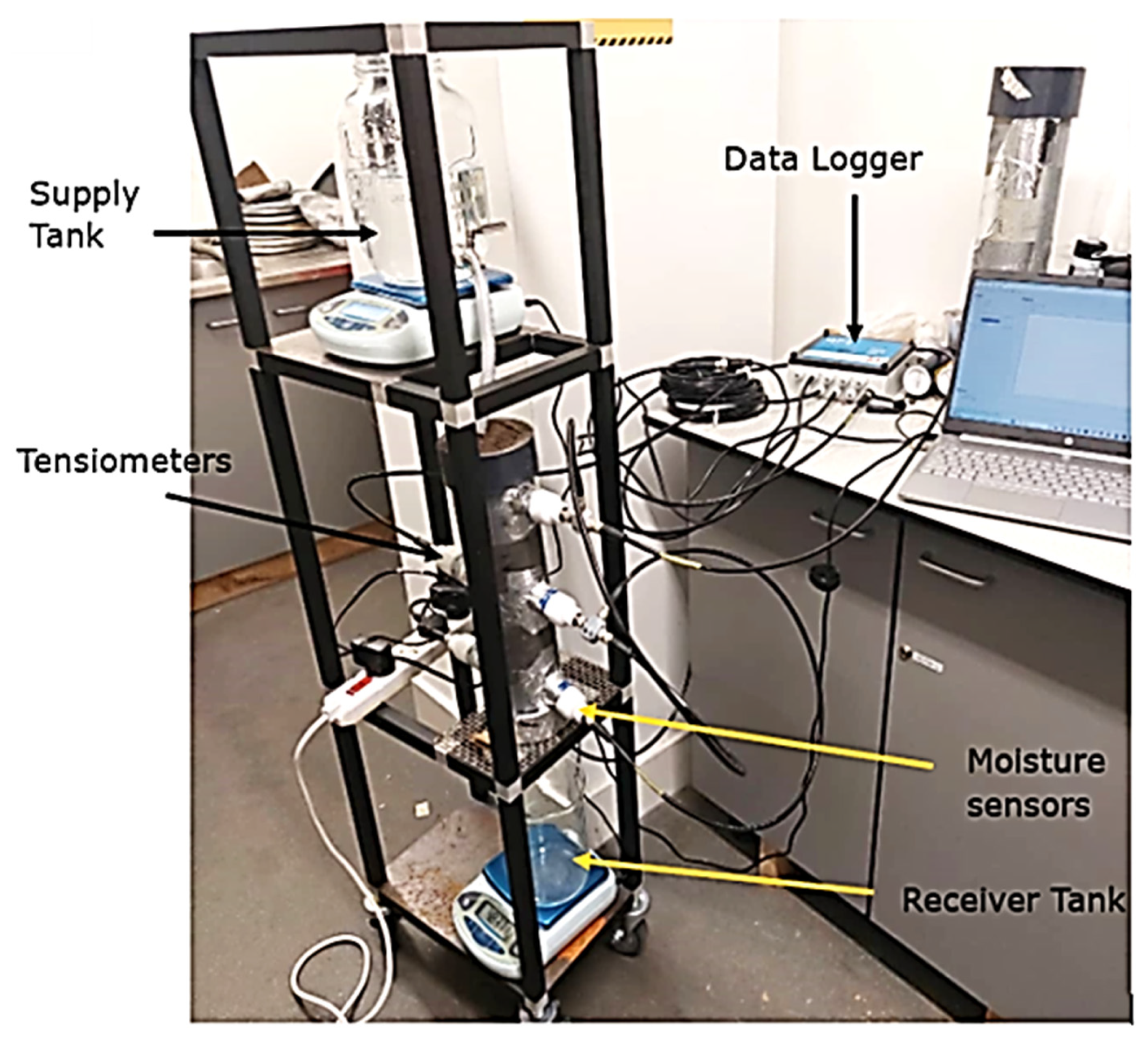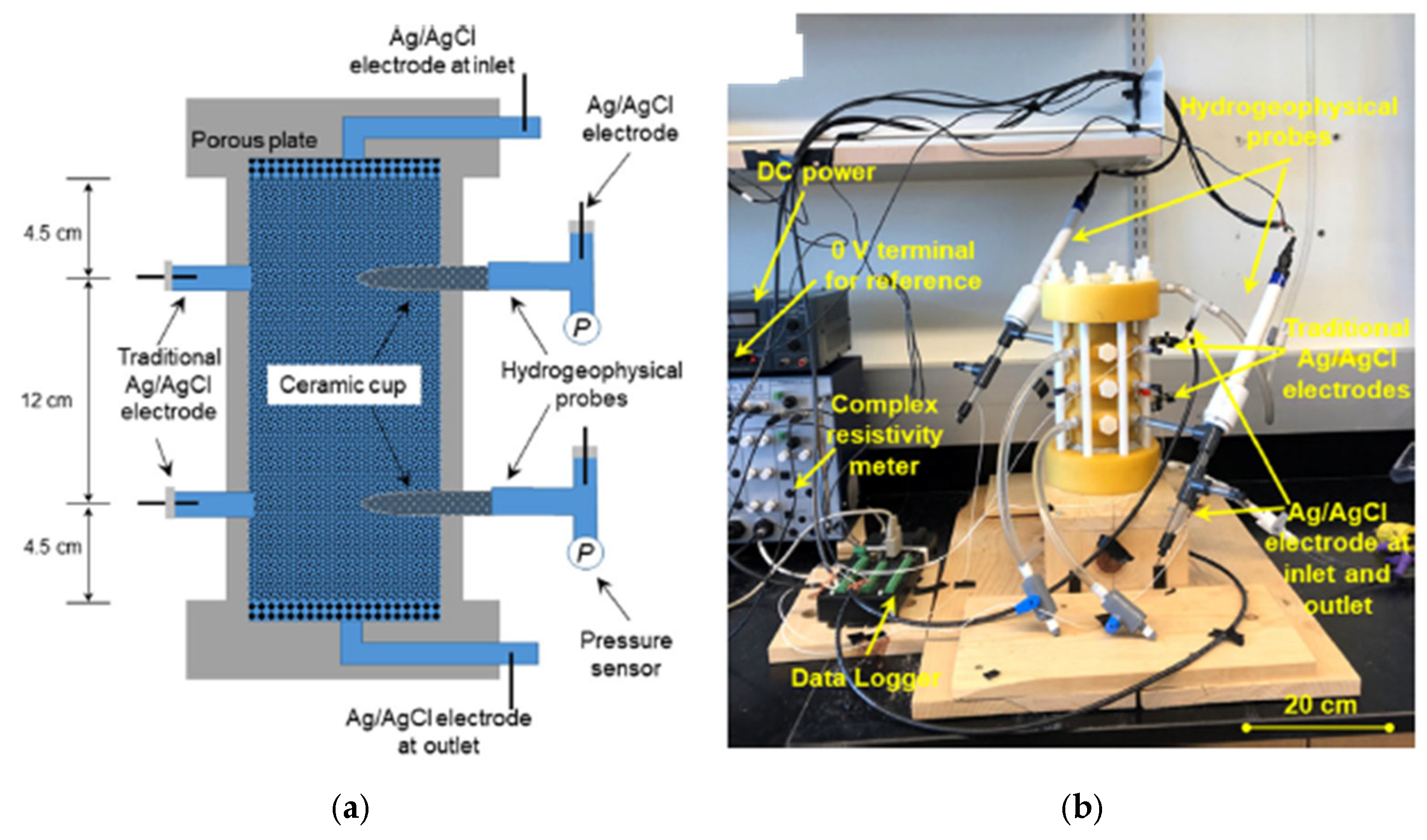 - Bienvenue, T.; Xie, J.; Niu, Q. Developing a soil column system to measure hydrogeophysical properties of unconsolidated sediment. Vadose Zone J. 2022, 21, e20186. [Google Scholar] [CrossRef]