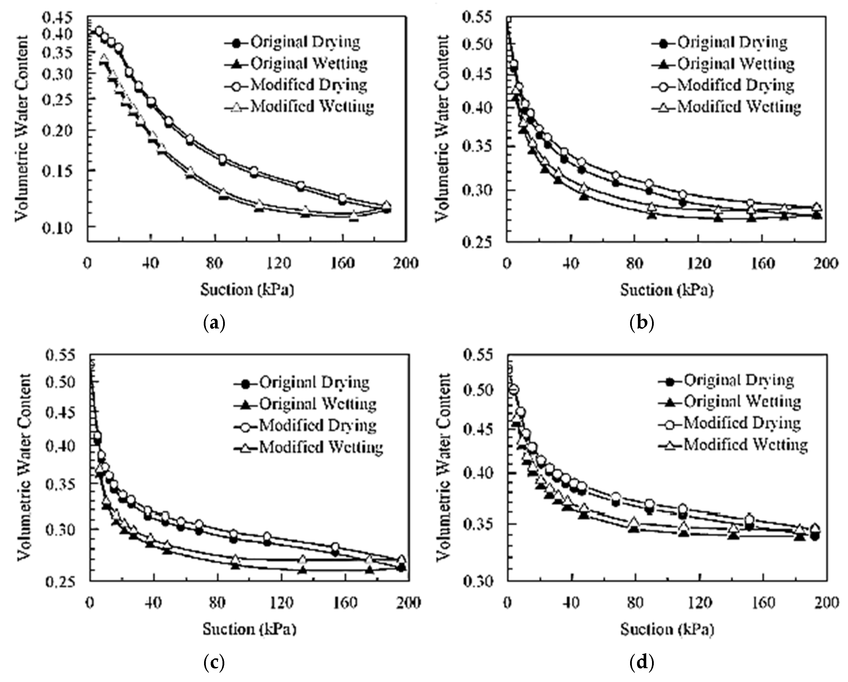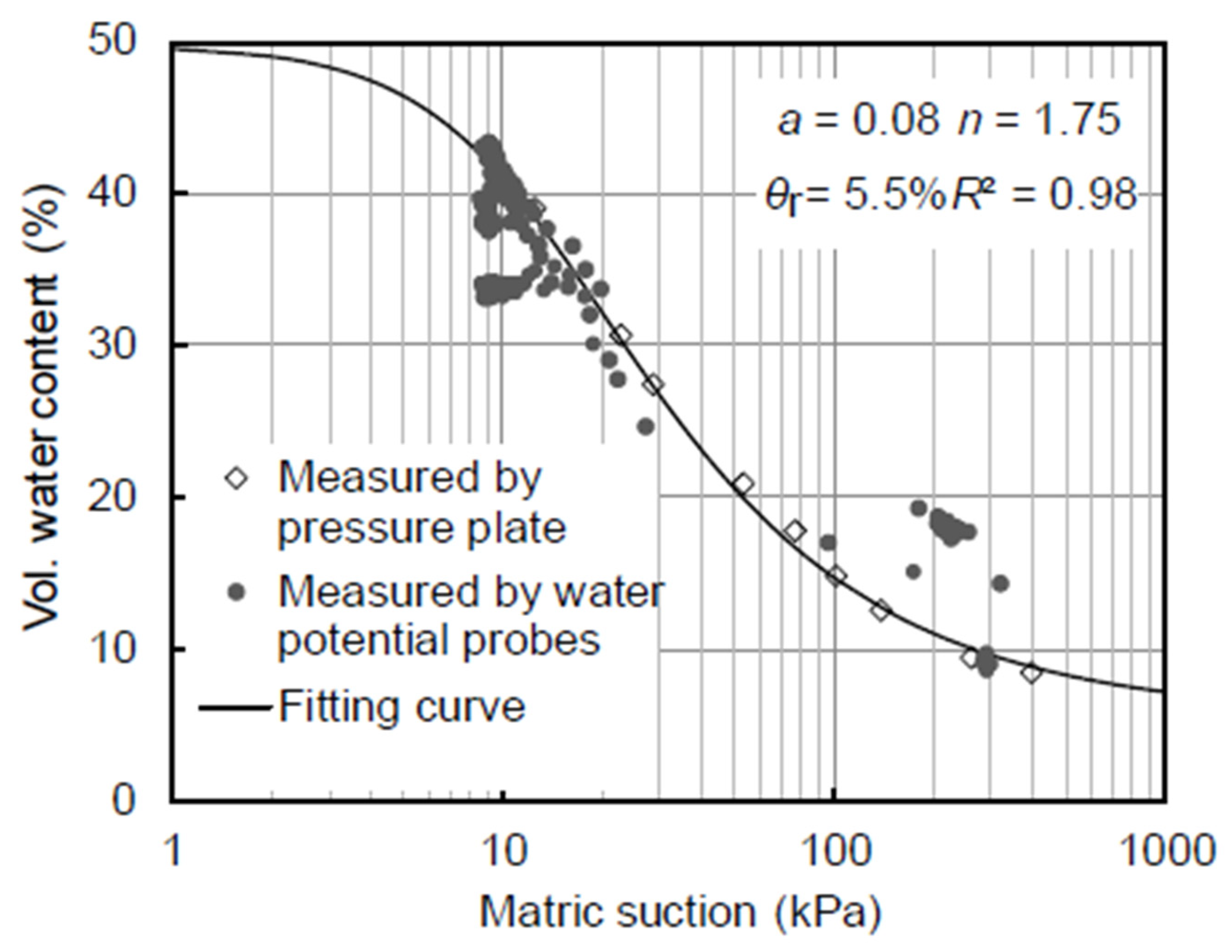 - Fredlund, D.; Xing, A. Equations for the Soil–Water Characteristic Curve. Can. Geotech. J. 1994, 31, 521–532. [Google Scholar] [CrossRef]